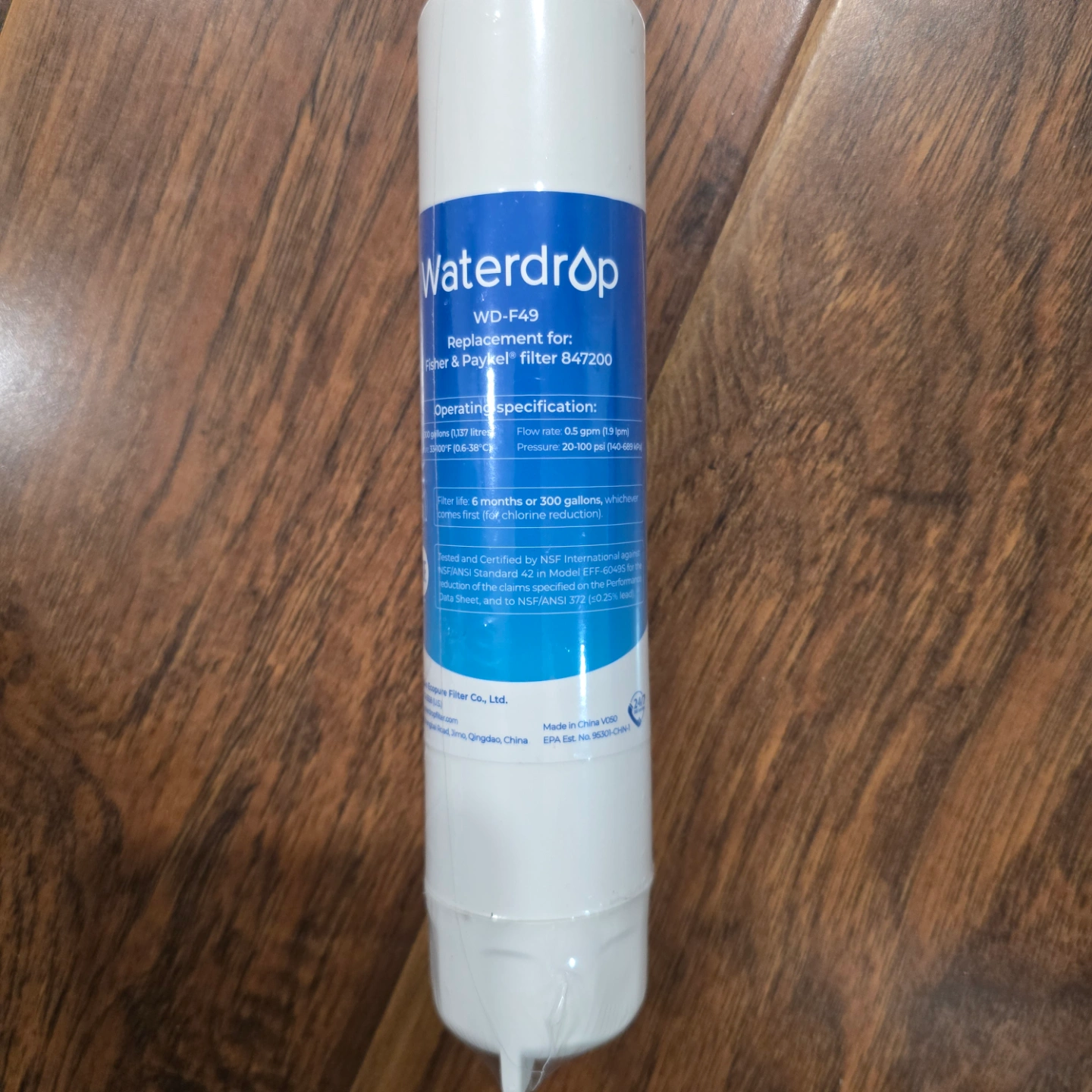 Water filter replacement. Compatible with Fisher & Paykel filter 847200. Filter life: 6 months or 300 gallons. Tested and certified by NSF International.
