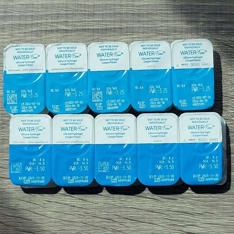25CAD$2 PER pair. 10 pieces of sphere power -325 & 10 pieces of -350 WaterFine silicone hydrogel contact lenses, transparent/ colorless. Total 20 pieces/ 10 pairs. BC: 8.6mm DIA: 14.0mm WC: 56%. Cooper Vision AquaGen Technology. 98% UVB, 78% UVA blocker. 0.5 MPa. 97% Breathability.