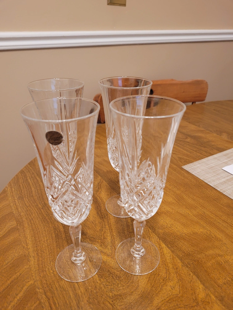 60Selling a set of four Waterford crystal champagne flutes. They have a beautiful, intricate design and are in great condition. Perfect for special occasions or adding a touch of elegance to your home! They are clear glass with a detailed crystal cut pattern.