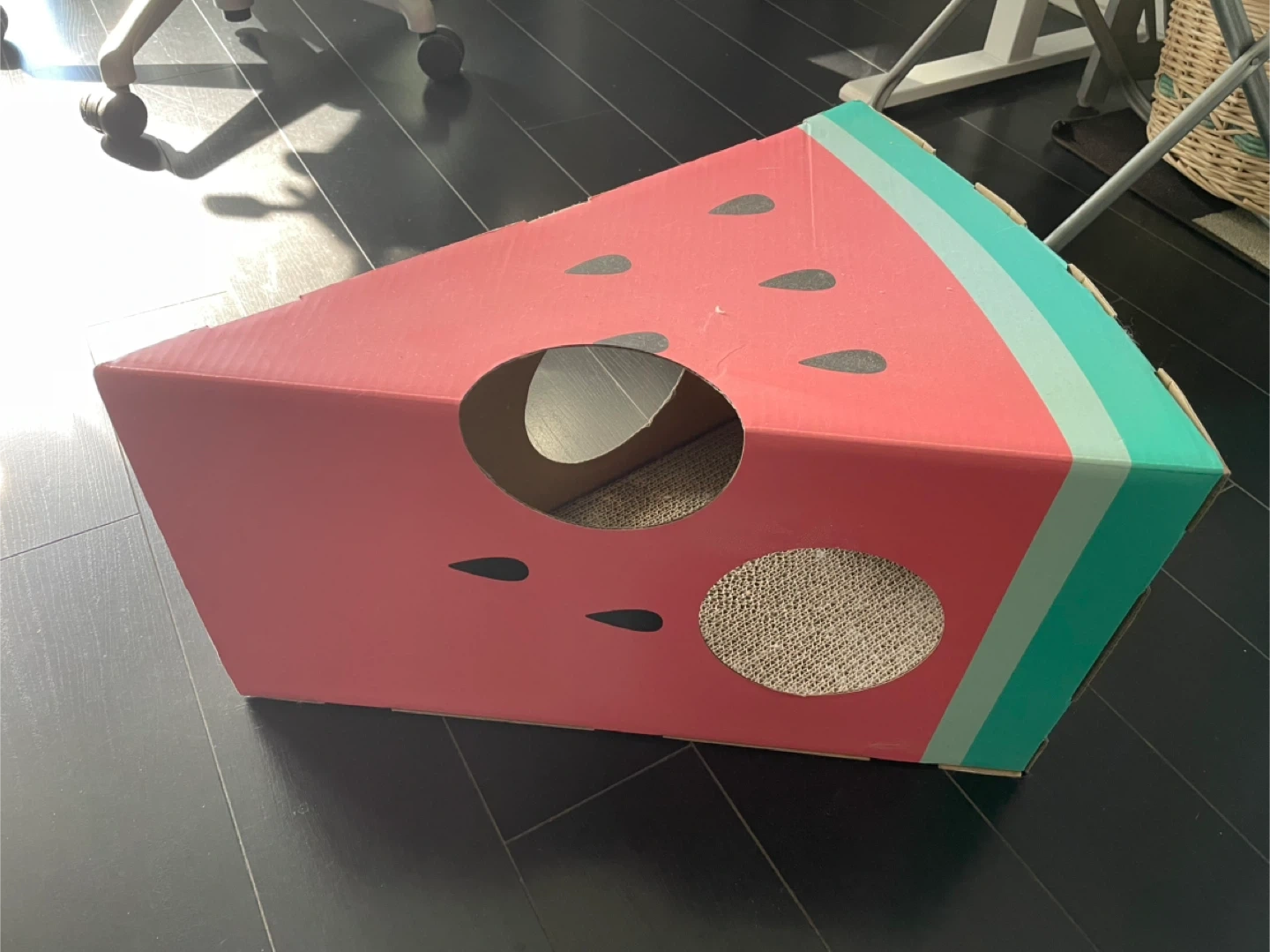 320This adorable watermelon-shaped cat house is perfect for your feline friend! It features a built-in scratch pad to keep your kitty entertained and their claws healthy. It's in great condition and ready for a new home. Your cat will love lounging and playing in this fun and unique cat house!
