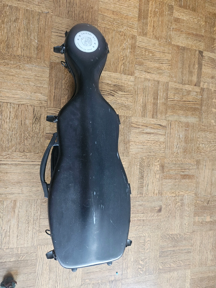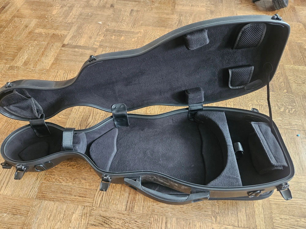 Black Bam Hightech Contoured violin case. Shows some wear. Includes interior accessory compartments. Durable and lightweight.