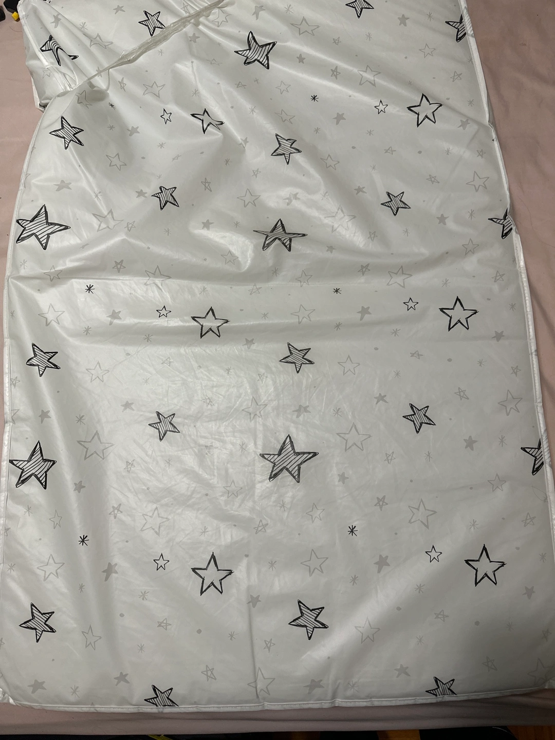 White waterproof mattress protector with a black star pattern. Suitable for a crib or toddler bed.