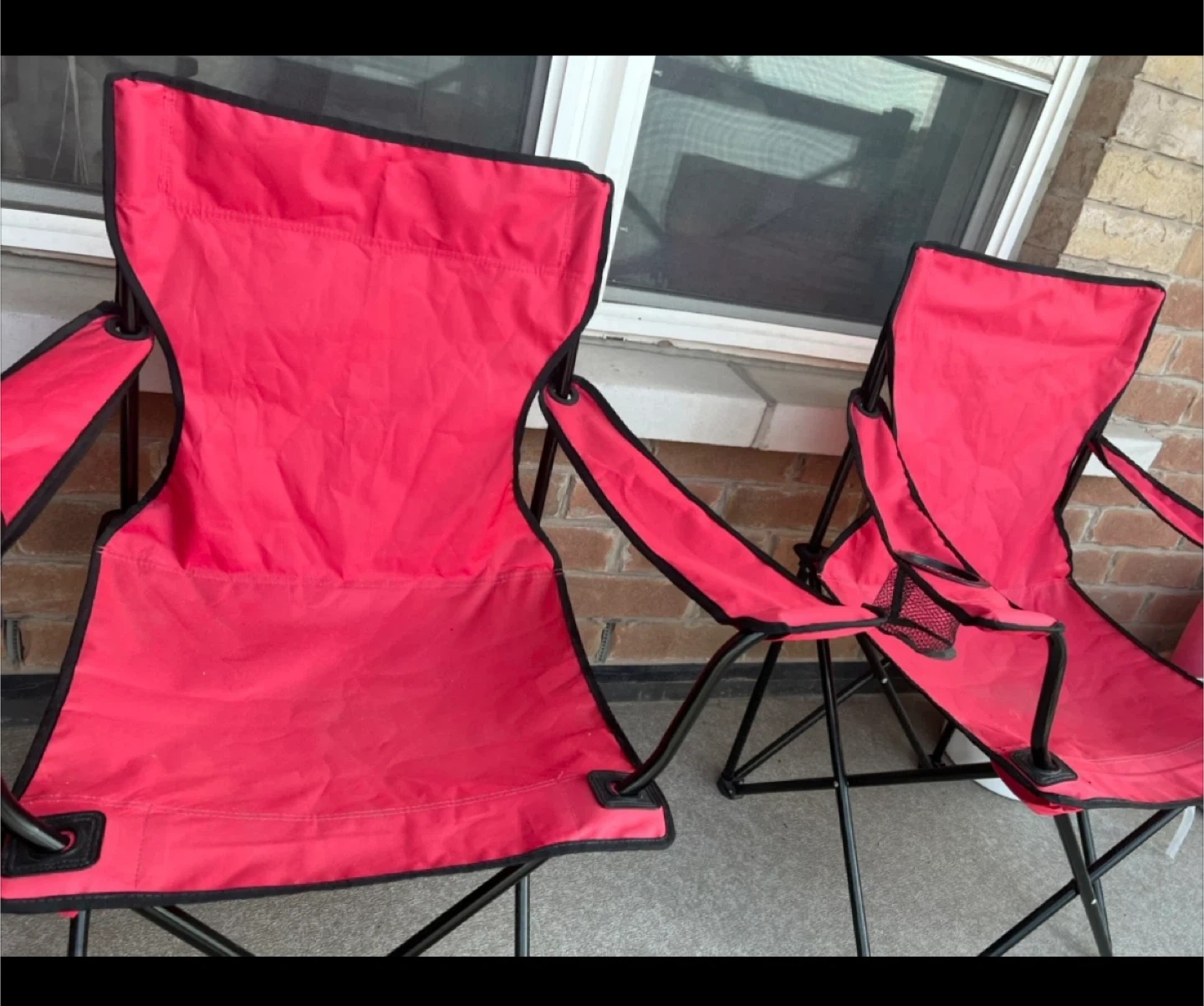Two red folding camp chairs with black trim and metal frames. Easy to set up for outdoor events or backyard lounging. Perfect for camping trips or sporting events!