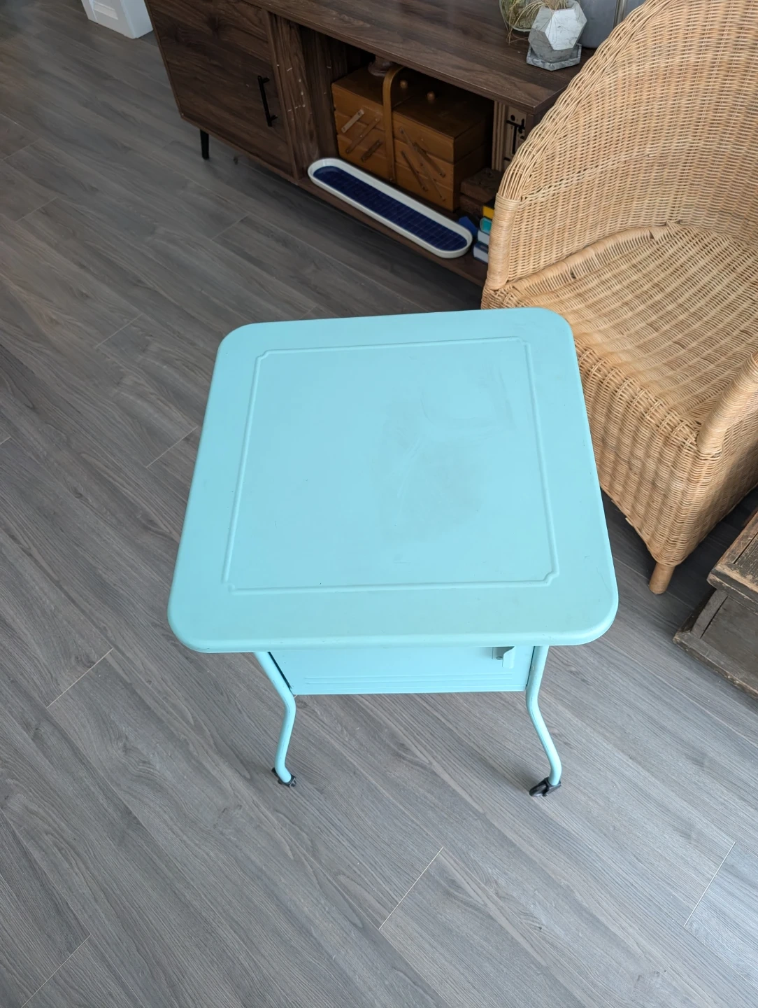 A light mint green metal side table with a single door cabinet and wheels. It's perfect for use as a nightstand or accent table. Metal construction.