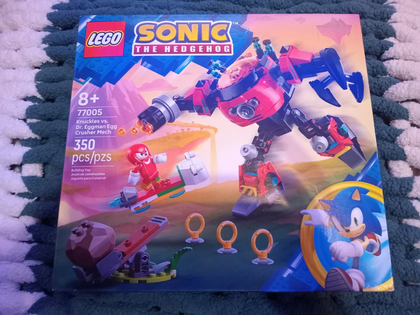 This is the LEGO Sonic the Hedgehog set 77005, Knuckles vs. Dr. Eggman Egg Crusher Mech. It includes 350 pieces. It's designed for ages 8 and up.