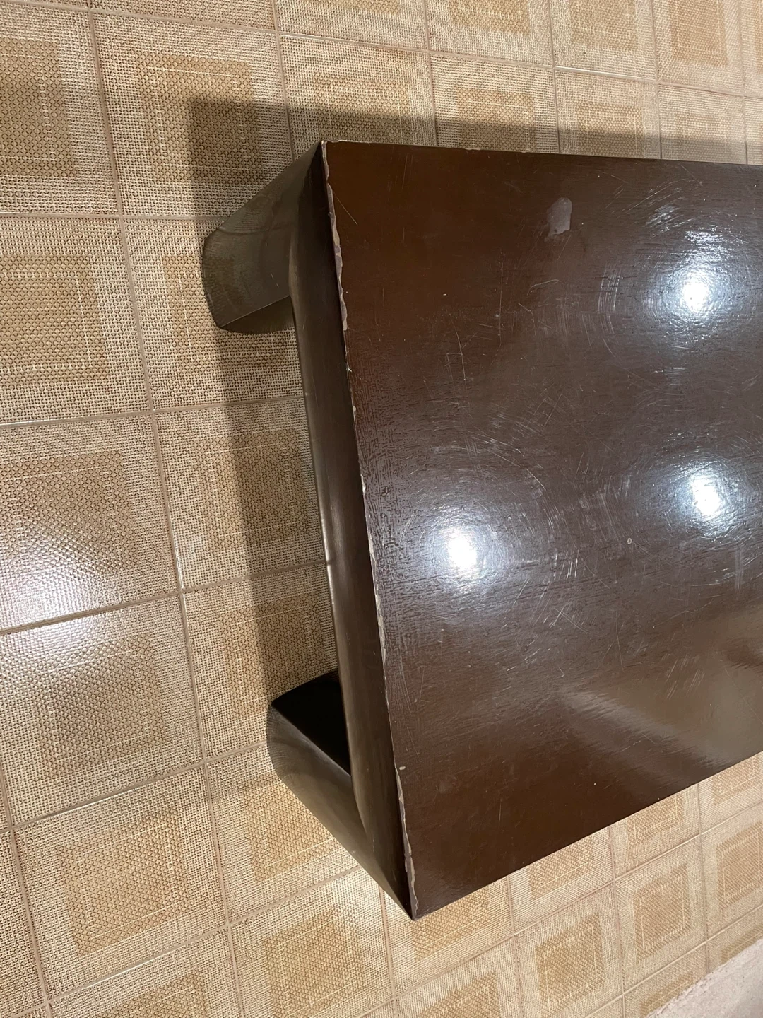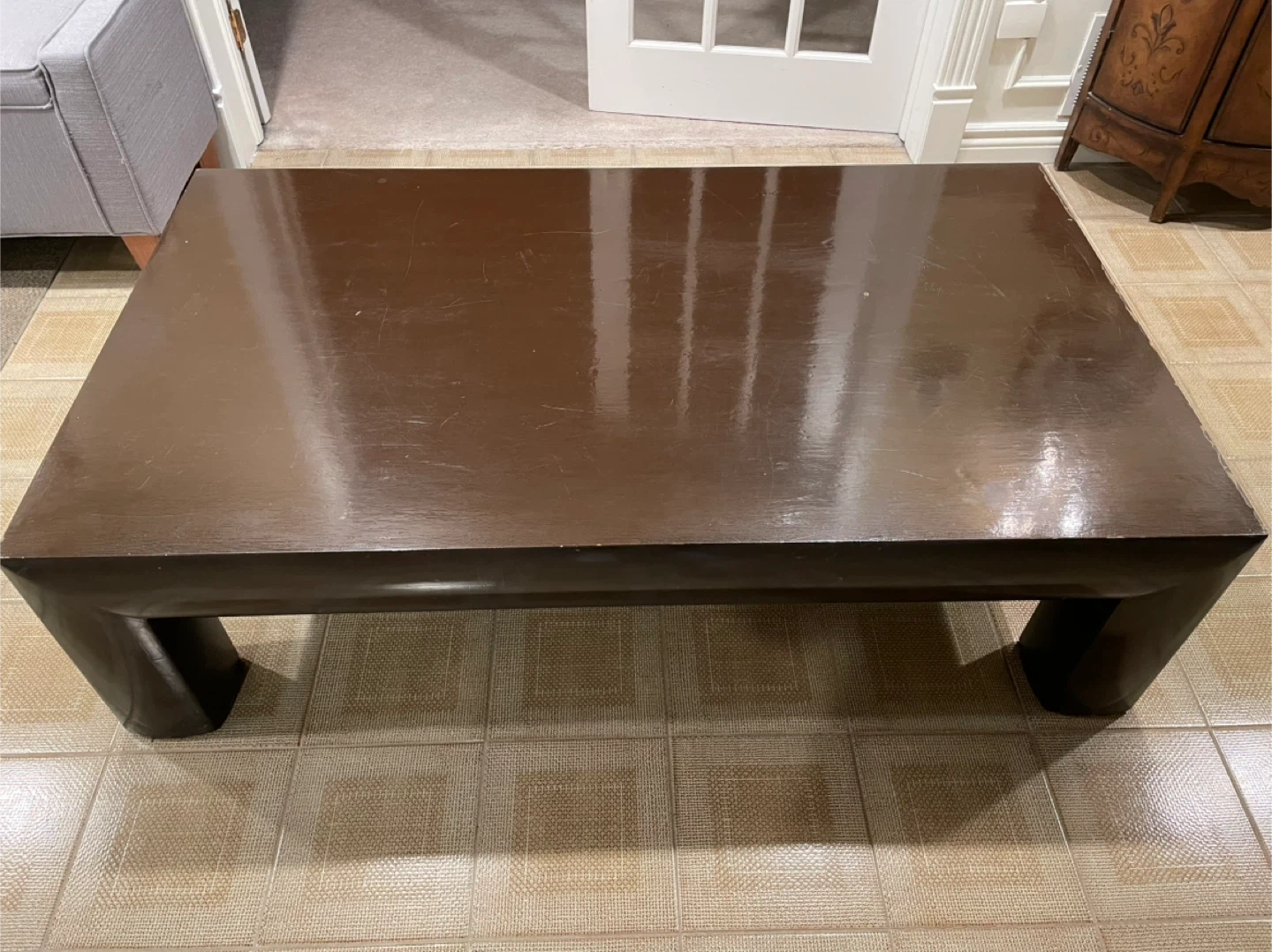 This dark brown coffee table has a sleek, rectangular design. It's heavy and solid. Has some scuffs. 32”x 55”