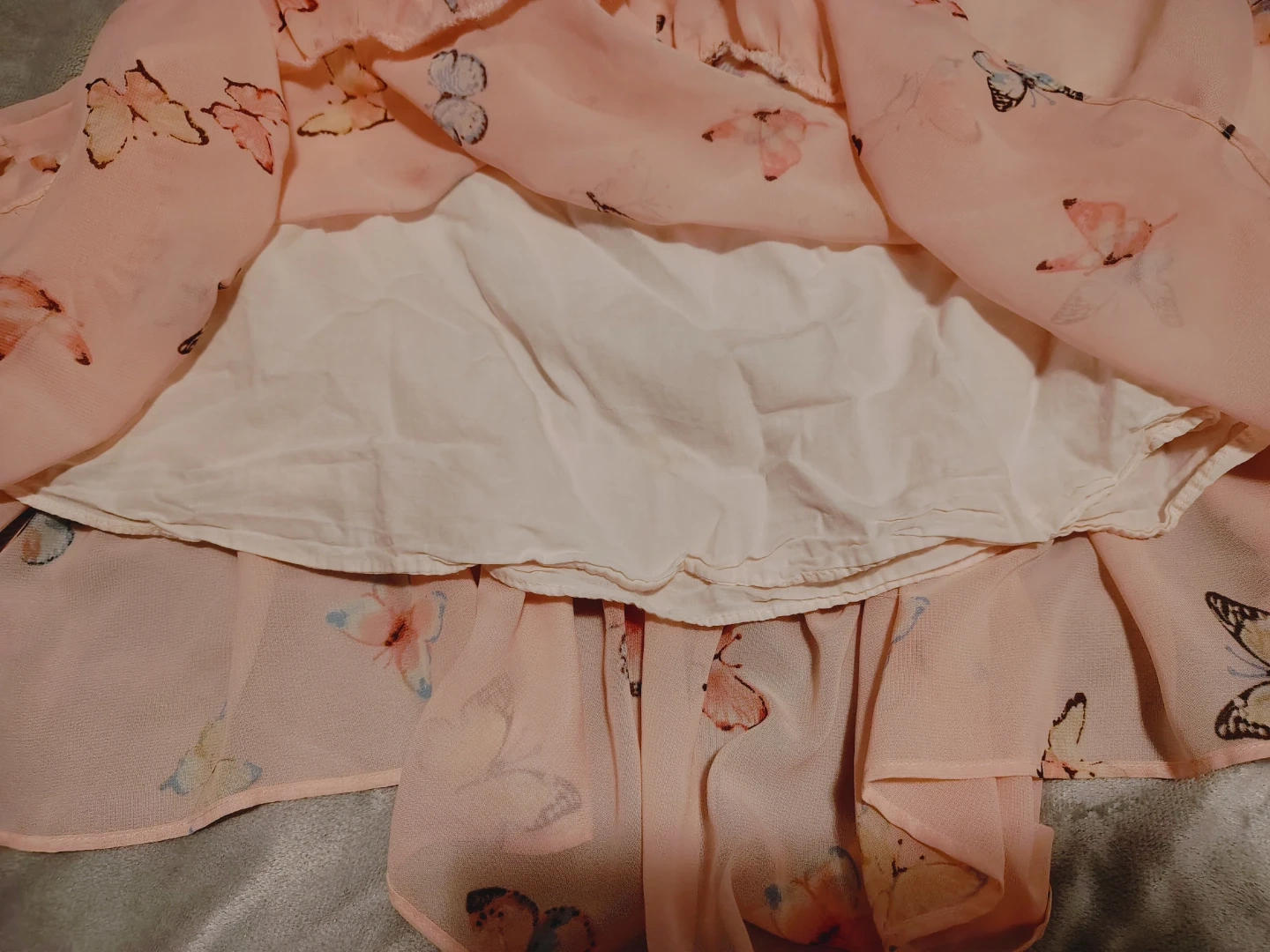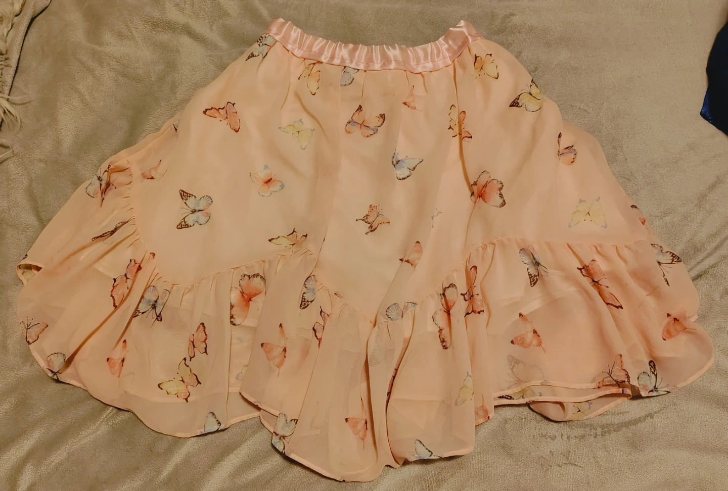 Light pink skirt with a cute all-over butterfly print. It features a ruffled hem and an elastic waistband for comfort. Chiffon outer layer with a plain lining. Looks so cute when it spins. Very fairycore. It's a bit big on me so I never reach for it. Size small-medium