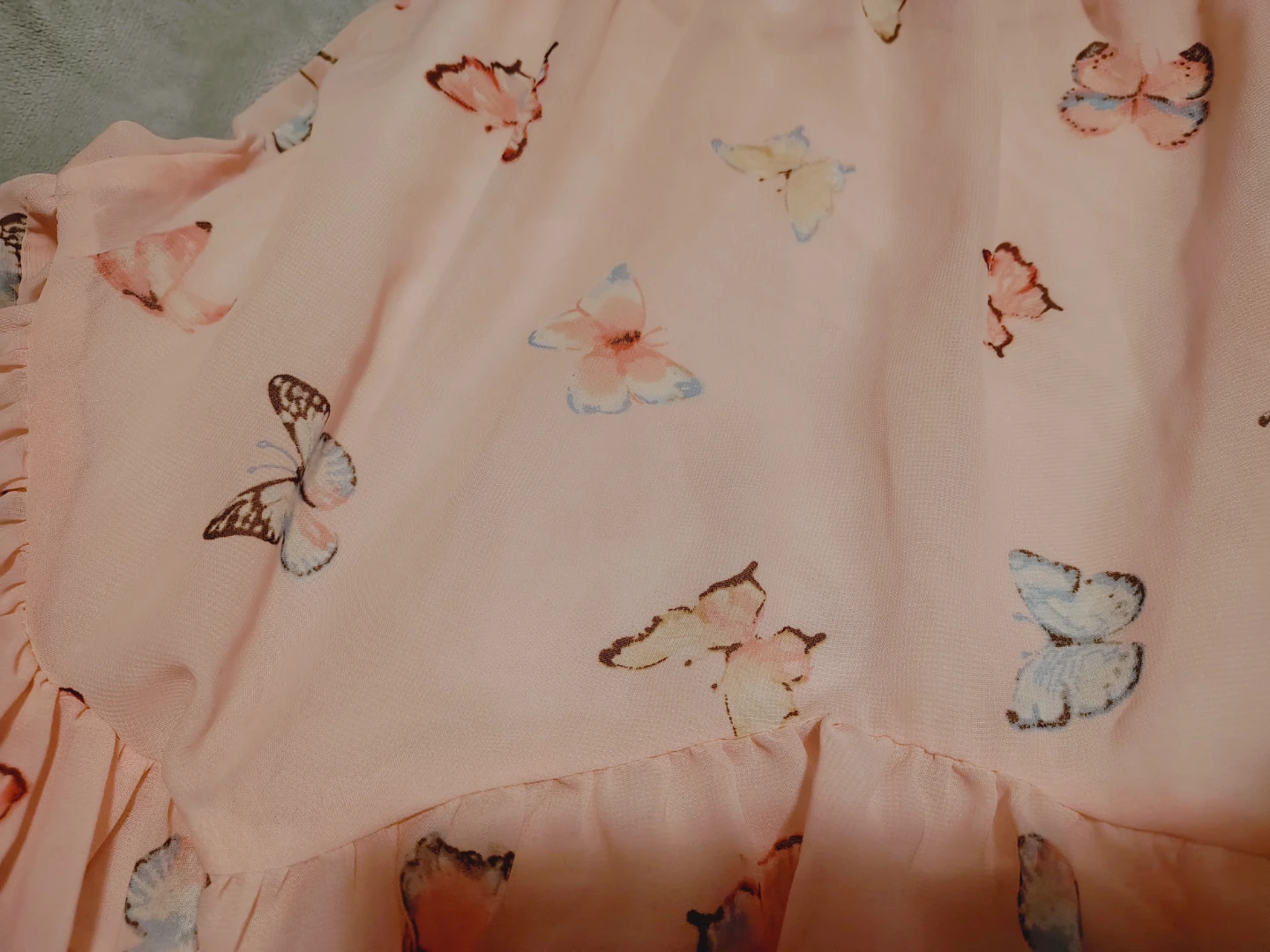 Light pink skirt with a cute all-over butterfly print. It features a ruffled hem and an elastic waistband for comfort. Chiffon outer layer with a plain lining. Looks so cute when it spins. Very fairycore. It's a bit big on me so I never reach for it. Size small-medium