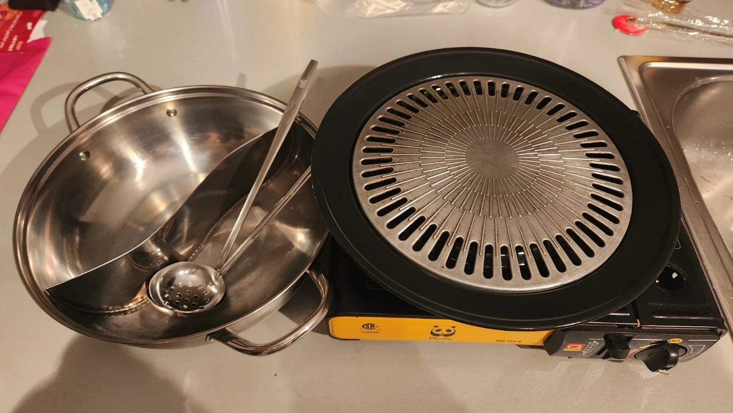 Selling a Panda smokeless BBQ grill plate and hot pot set! It looks like a great set for indoor grilling and hot pot fun. The set includes a hot pot, grill plate, and a portable gas stove. It's in good condition and ready for your next cookout!