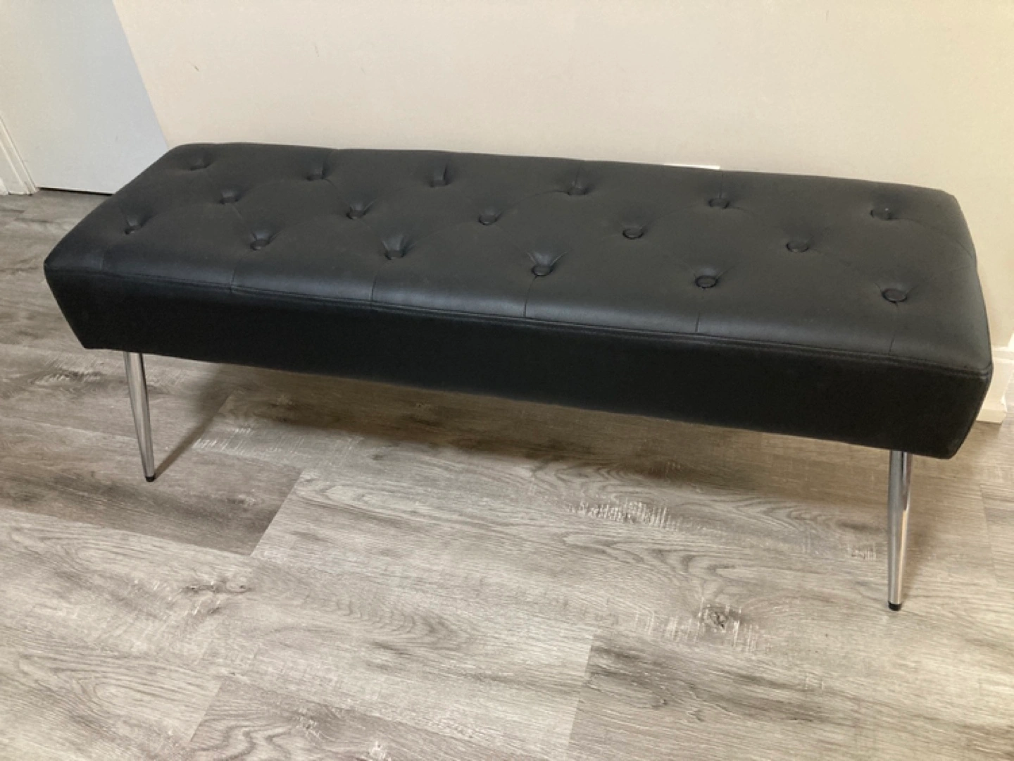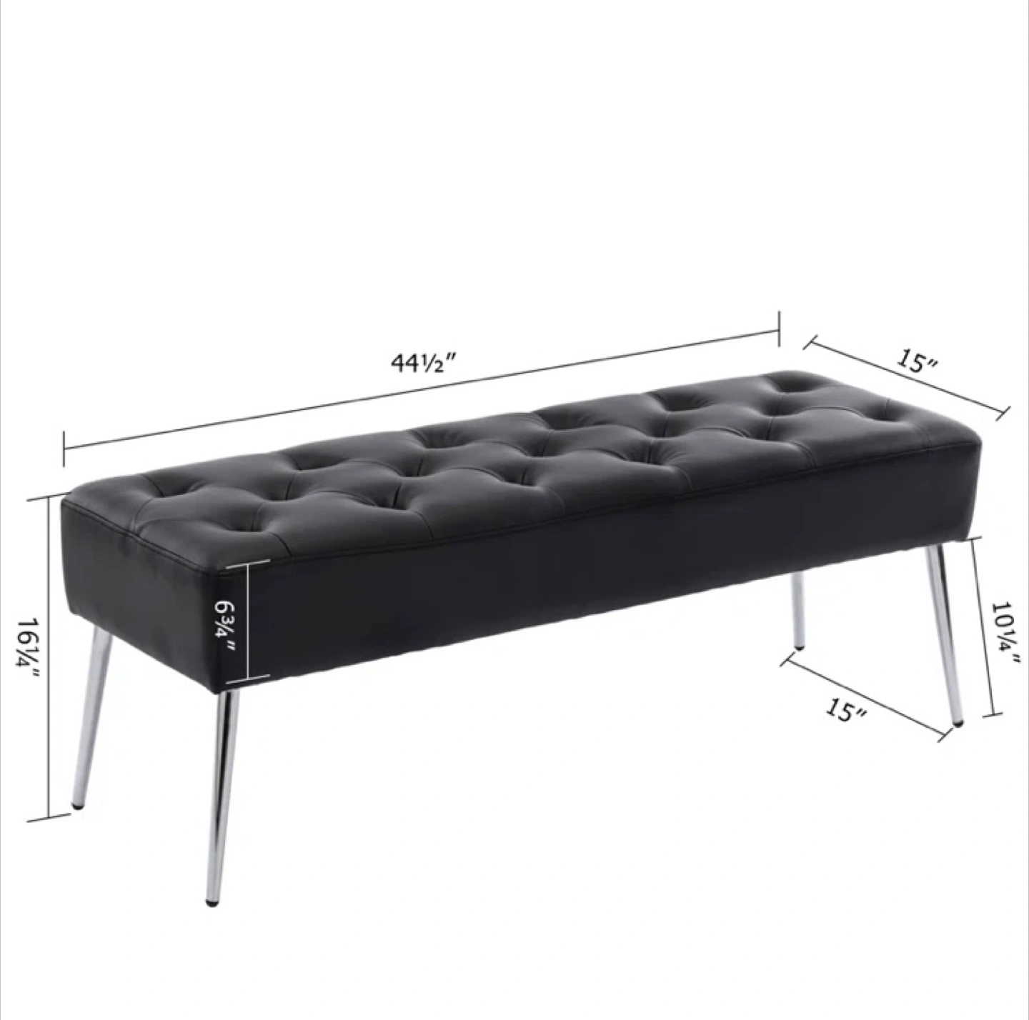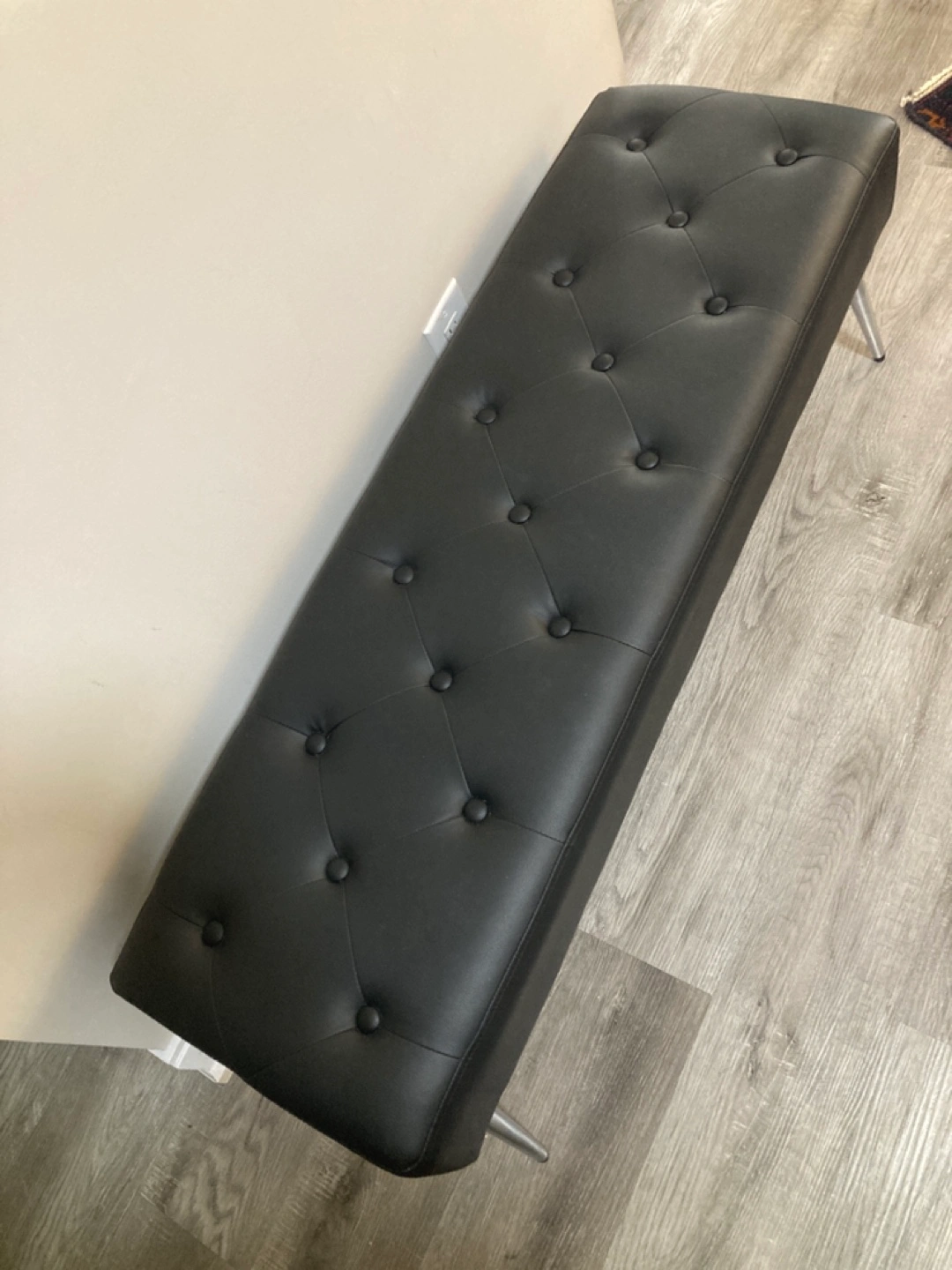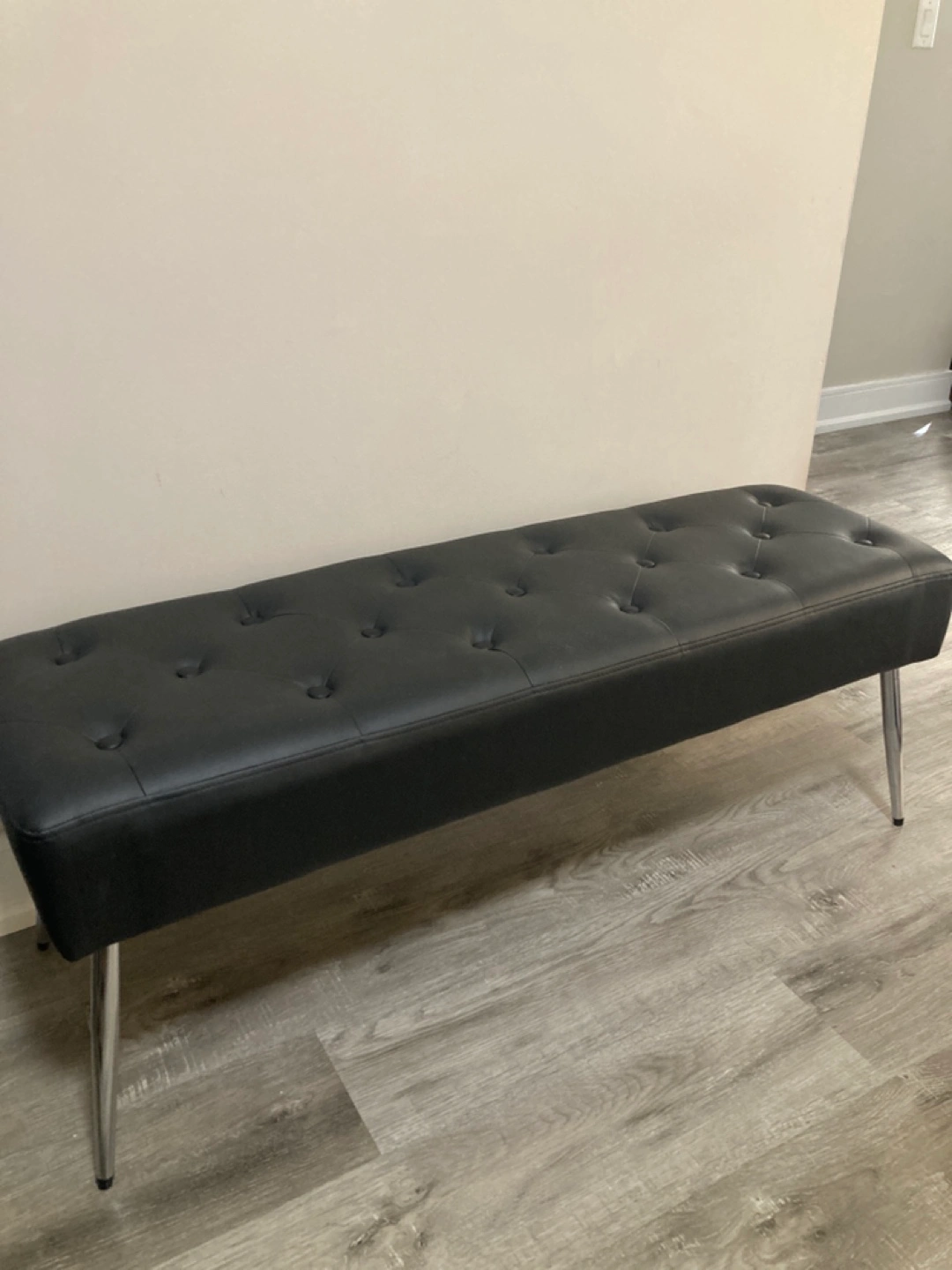 62Stylish black bench. Button tufted seat. Sleek silver legs. It's newly bought from Wayfair and the websites price is $189. Perfect for entryway or bedroom.