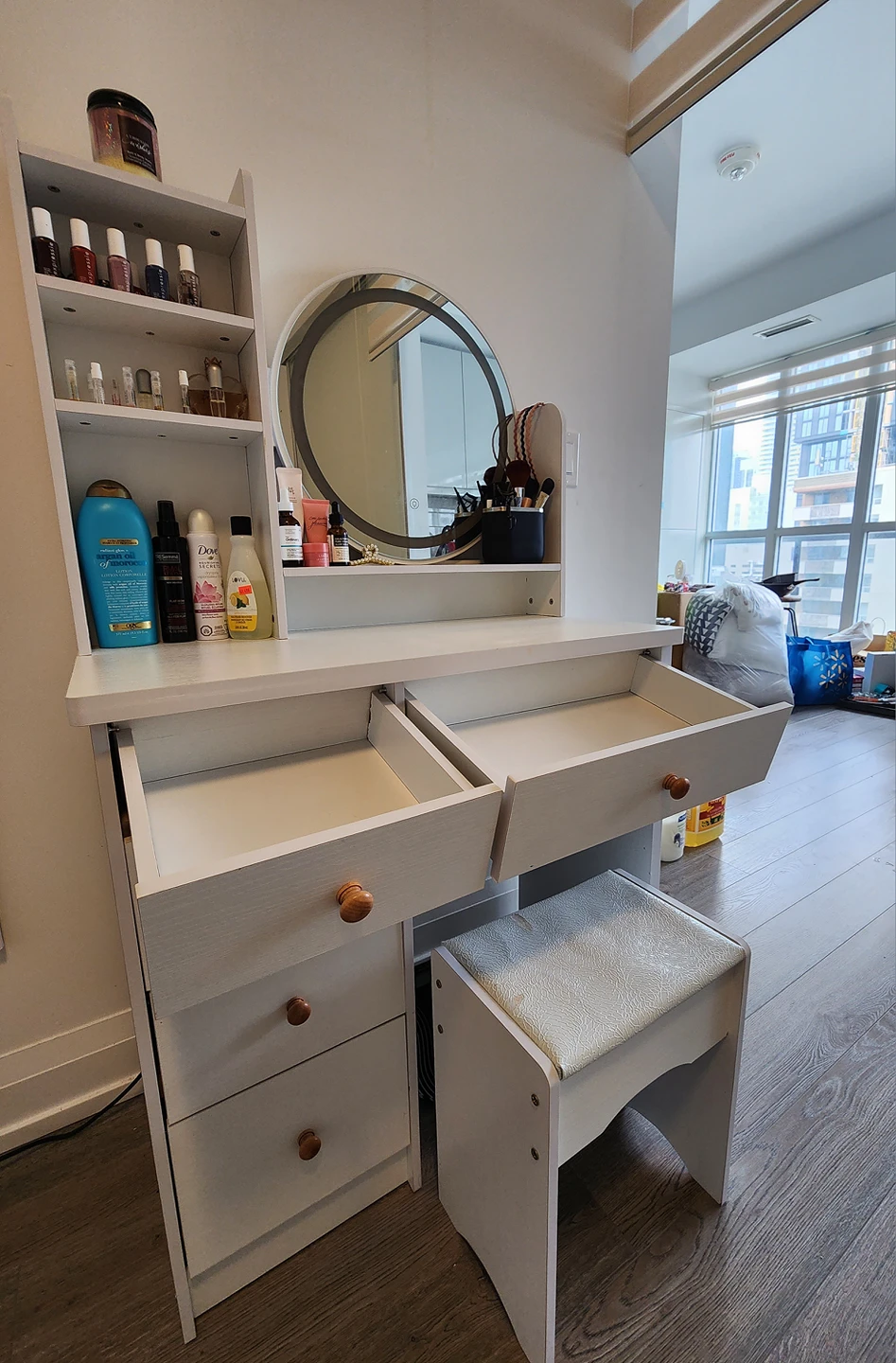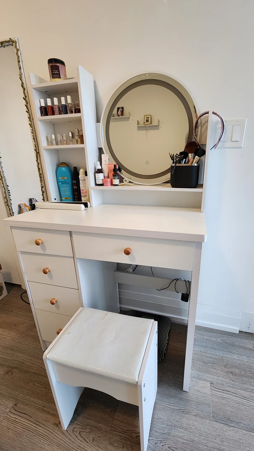 40White vanity table with chair (some scratches on the chair surface but still good condition) 3 Lighting modes available on the mirror but not working (can be fixed) The top shelves can be disassembled if needed for easy pick-up. Dimensions in picture. Pick up only near Yonge Dundas Square