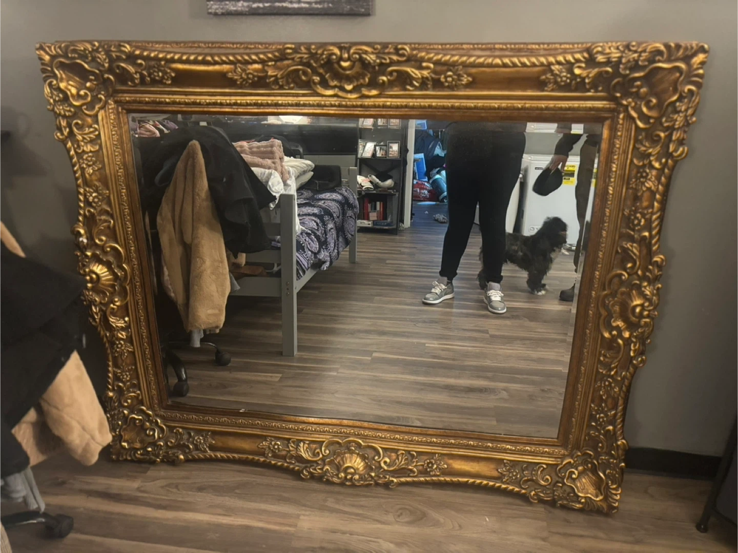 This is a large antique mirror with an ornate gold frame. It's a substantial piece perfect for making a statement in any room. Frame material appears to be wood with a gilded finish. Likewise there are brackets and wire for hanging already installed in the piece.