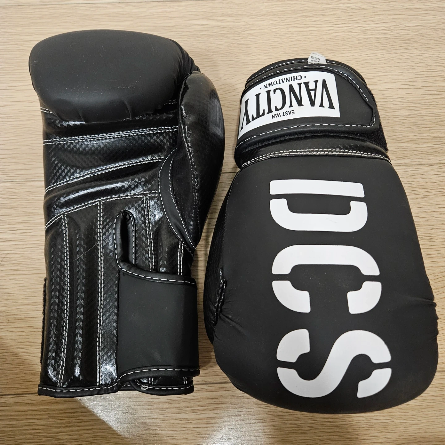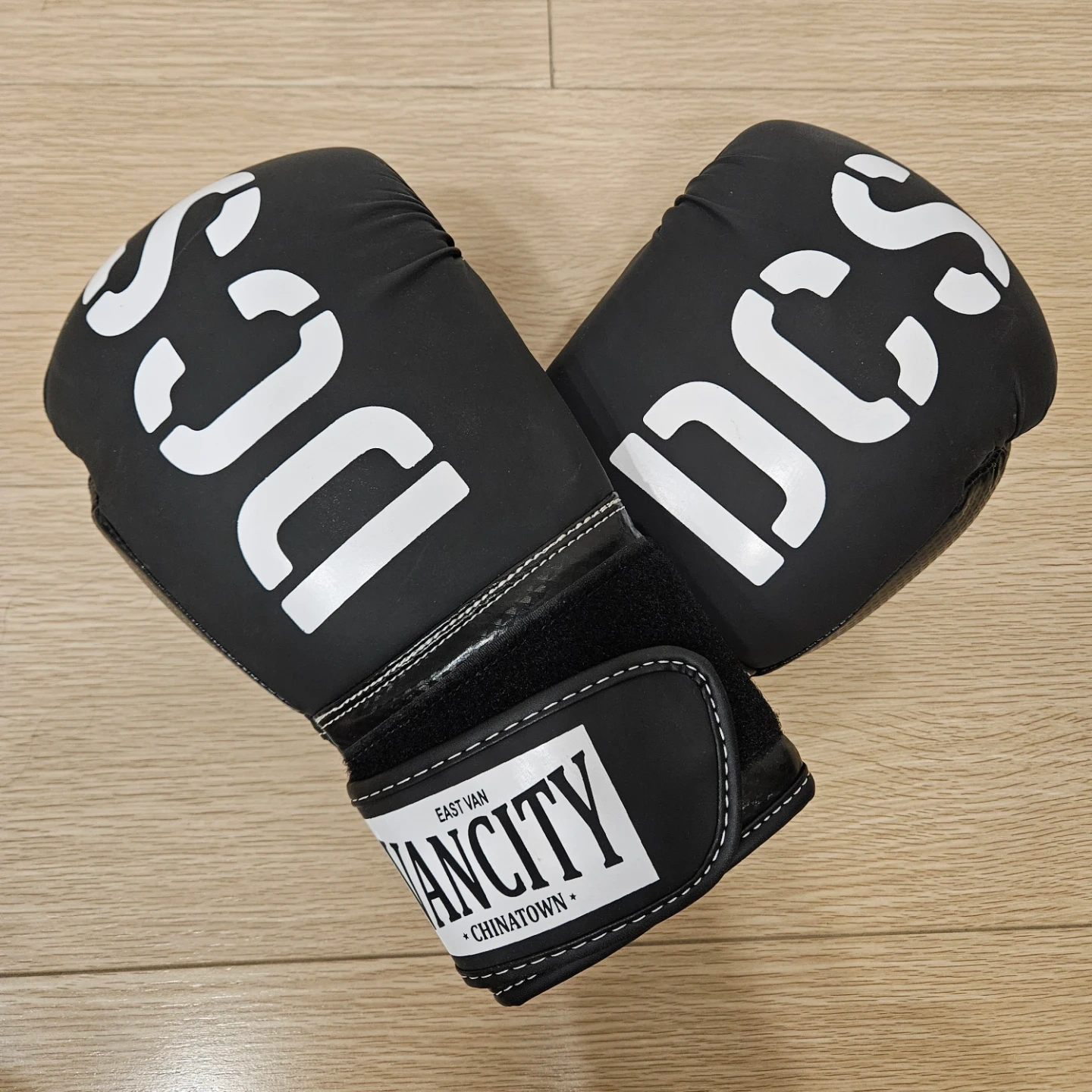 A pair of Black boxing gloves from VANCITY DCS, East Van Chinatown. Features a durable material and secure velcro strap closure. Great for training!