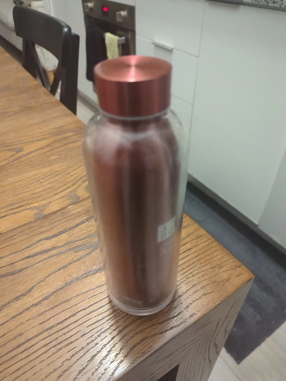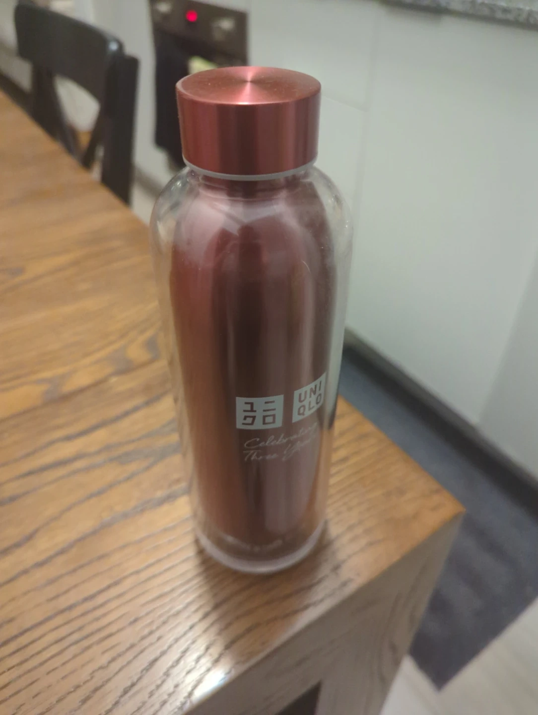 UNIQLO reusable glass water bottle with a metal lid. It says "Celebrating Three Years" on the side. It's great for staying hydrated on the go!