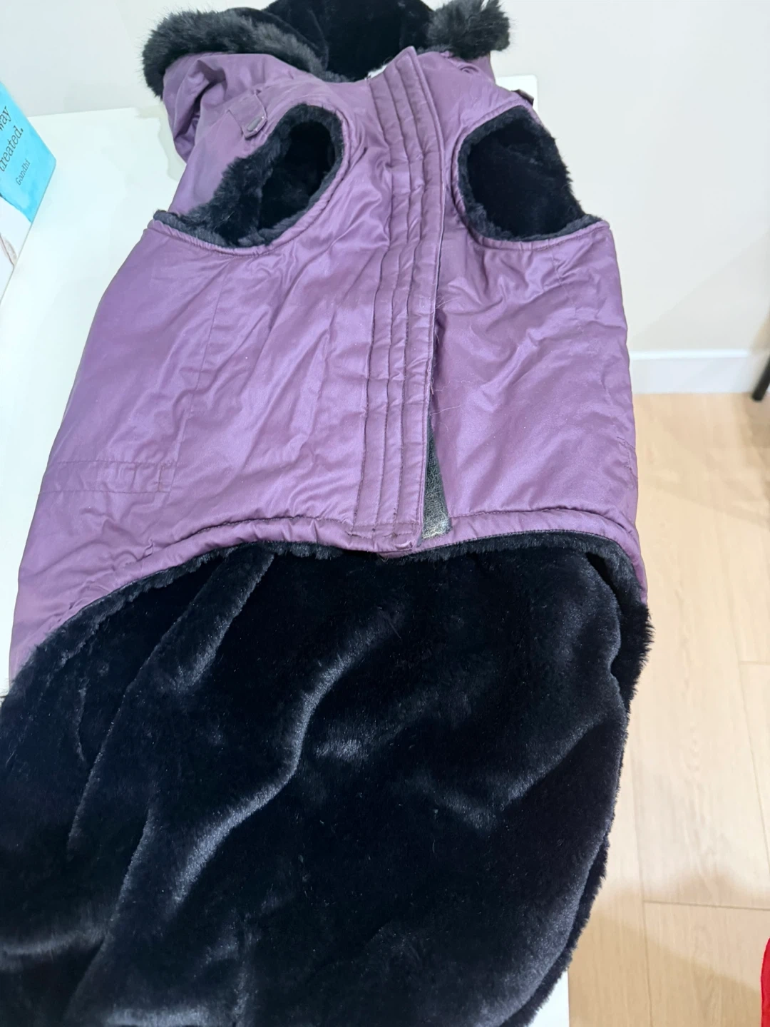 Canada Pooch winter dog vest is lined with black faux fur for warmth. It features a hood and adjustable closures. Size 26. Used only a couple of times, has a small rip but not noticeable and it was caused due to a move.