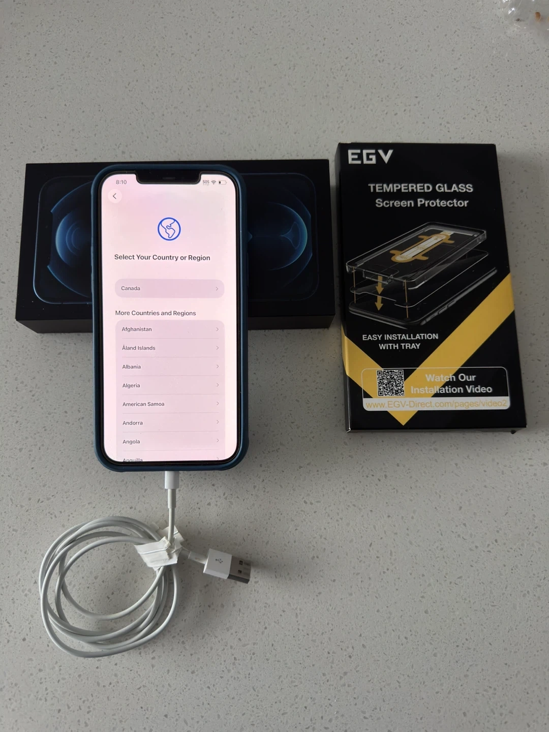 It's a blue iPhone 12 Pro Max. Includes original box, USB-C cable, and a tempered glass screen protector and case.