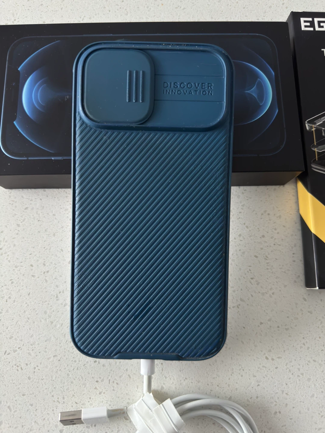 It's a blue iPhone 12 Pro Max. Includes original box, USB-C cable, and a tempered glass screen protector and case.