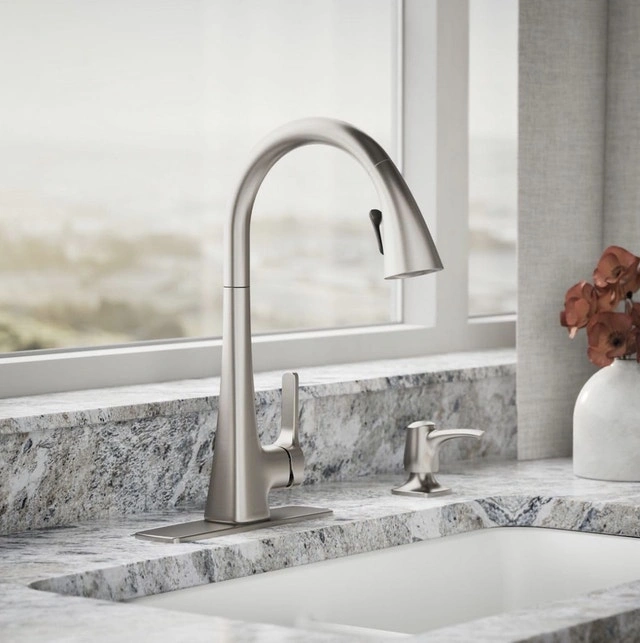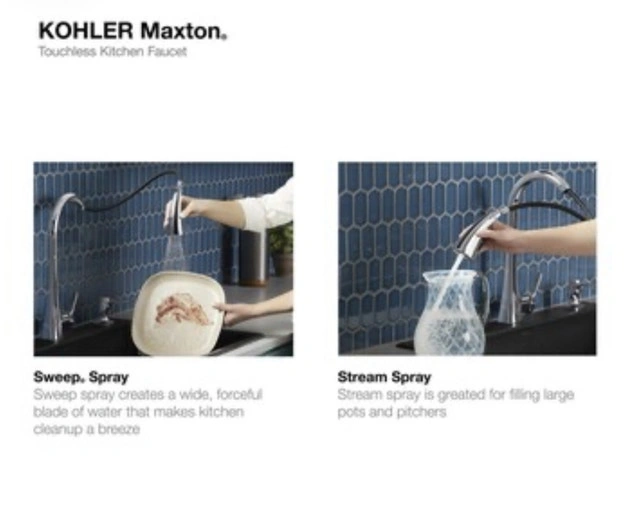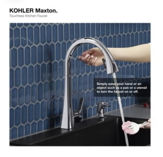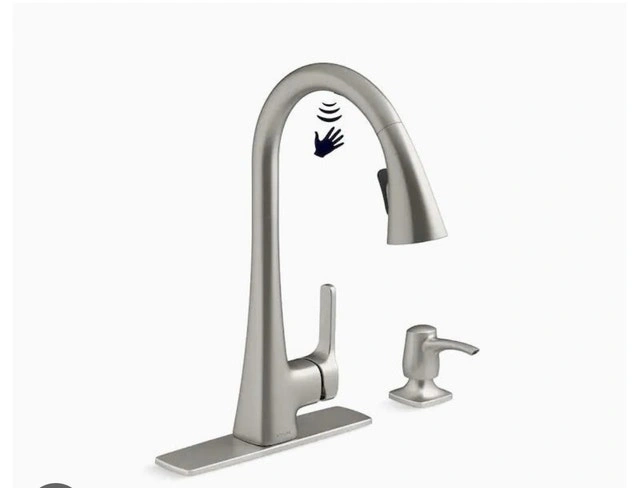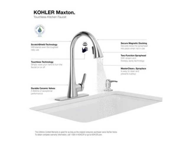 Brand new in box! KOHLER Maxton Touchless Pull-Down Kitchen Faucet. Features Response touchless technology with a sensor under the spout for convenient, germ-free operation. Includes a pull-down spray head with two functions: aerated stream and Sweep® spray. The DockNetik® system securely docks the sprayhead. MasterClean™ sprayface is easy to clean. High-arch spout provides clearance for pots. Temperature memory is included. Box includes: Assembled faucet, supply lines, escutcheon plate, and a matching soap/lotion dispenser. If the ad is up, the faucet is available!