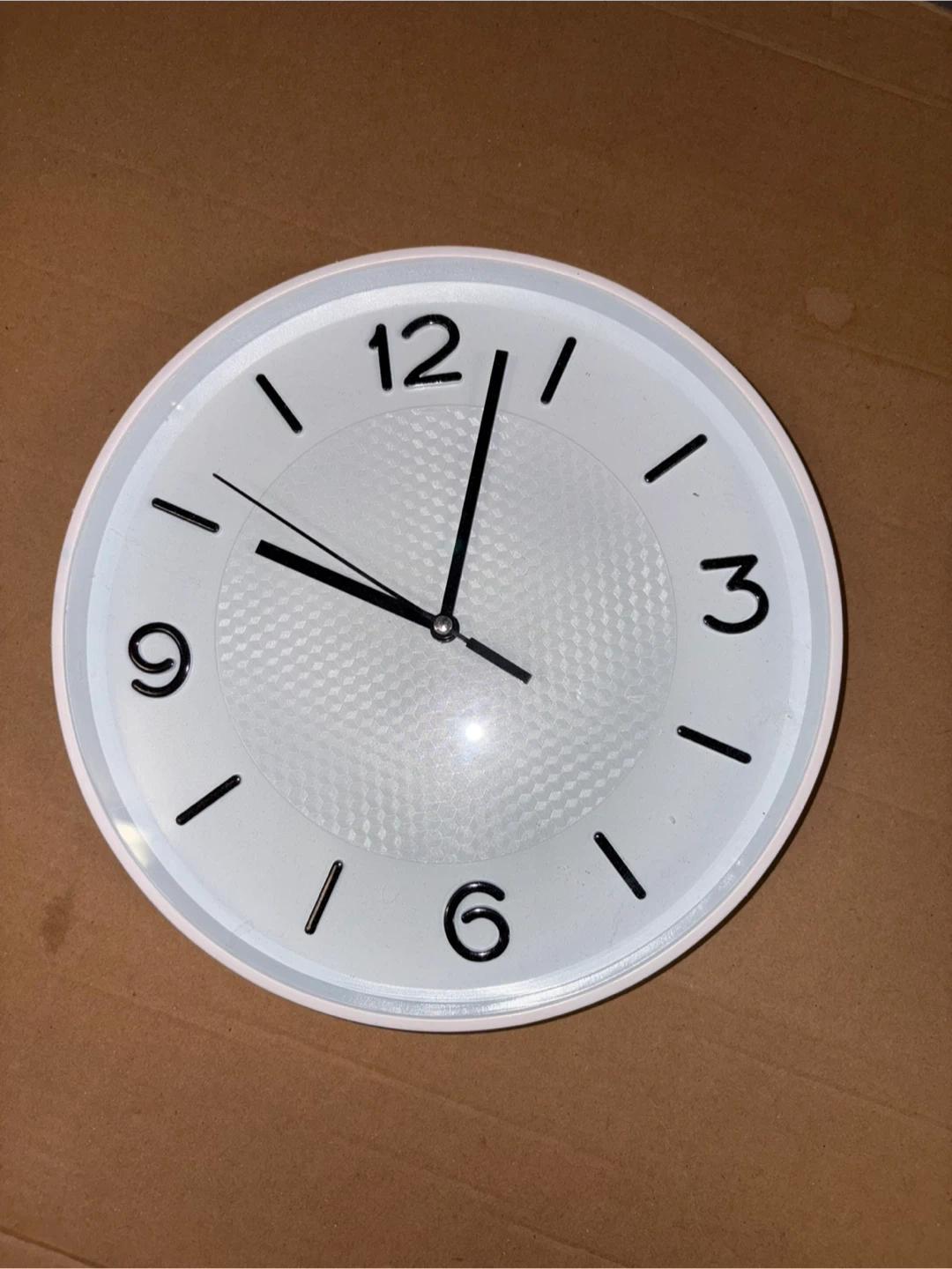 Selling a simple white wall clock. It has a clean, minimalist design with black numerals and hands. Perfect for any room in the house!