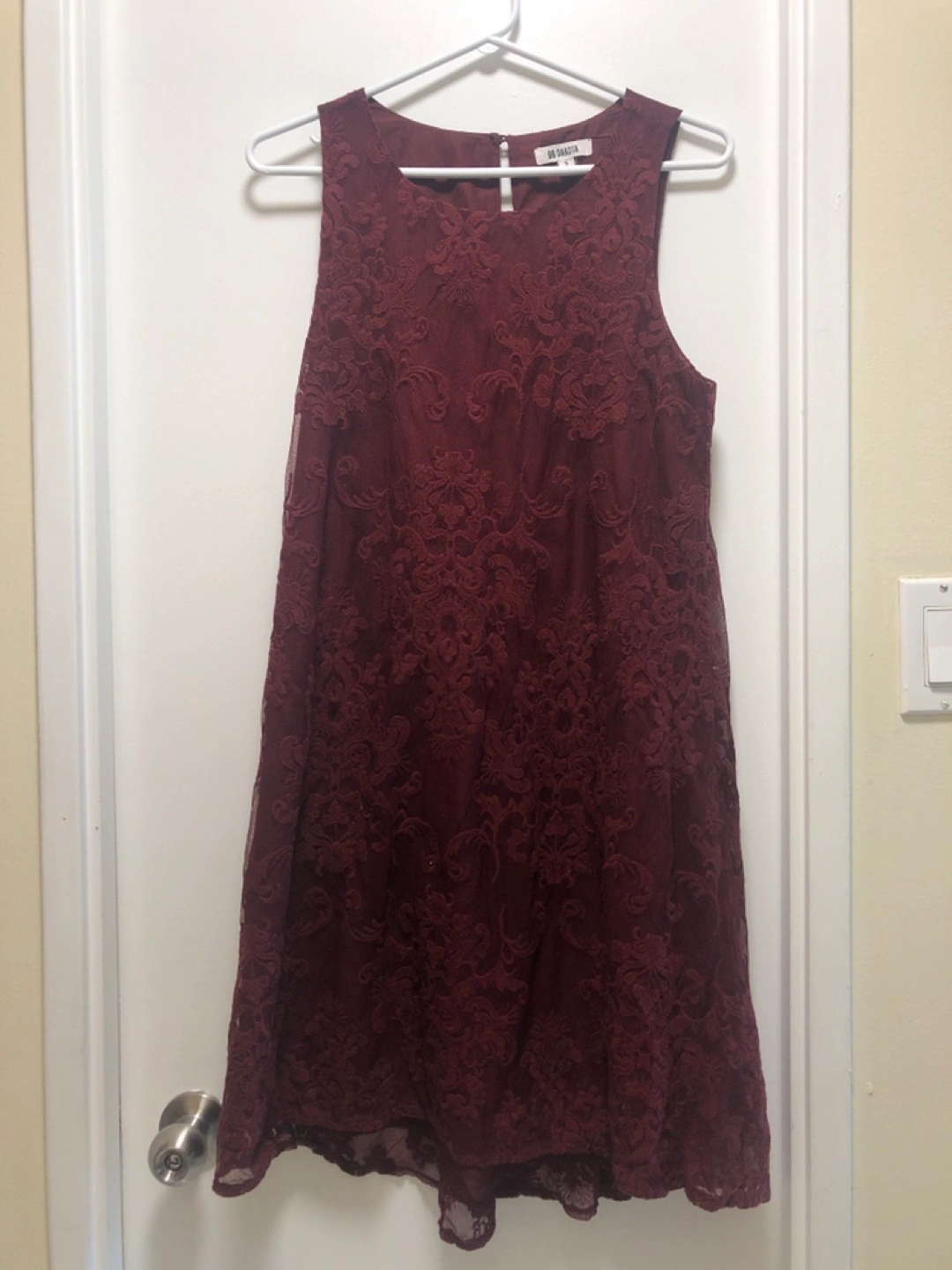 Burgundy lace dress with sleeveless design and a fitted bodice. A-line silhouette, lined, with a back zipper closure.