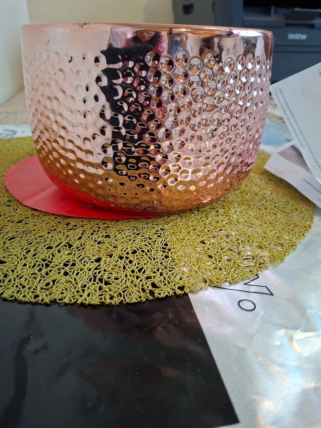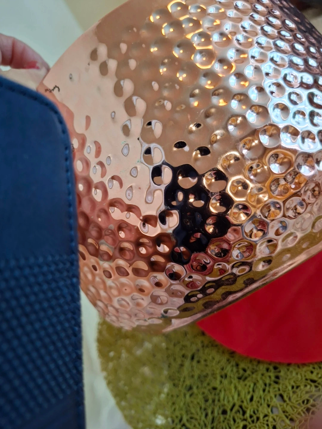 Beautiful hammered copper effect planter pot. It features a textured finish that catches the light. This pot is perfect for adding a decorative touch to your home or garden.