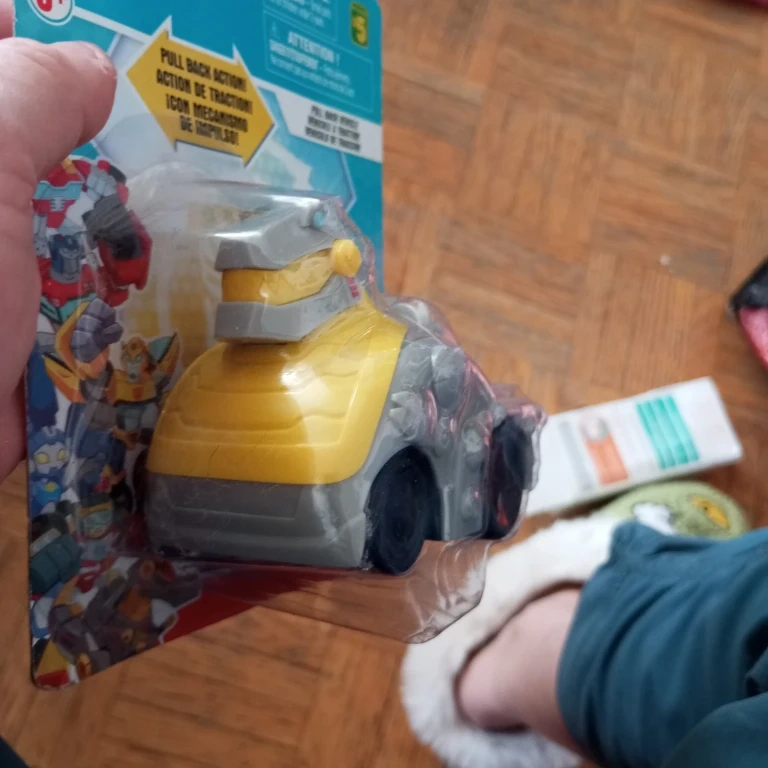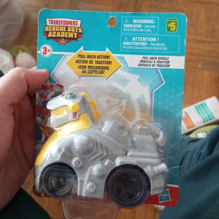 This Transformers Rescue Bots Academy vehicle features pull-back action. It's designed for kids aged 3 and up. The vehicle is grey and yellow.