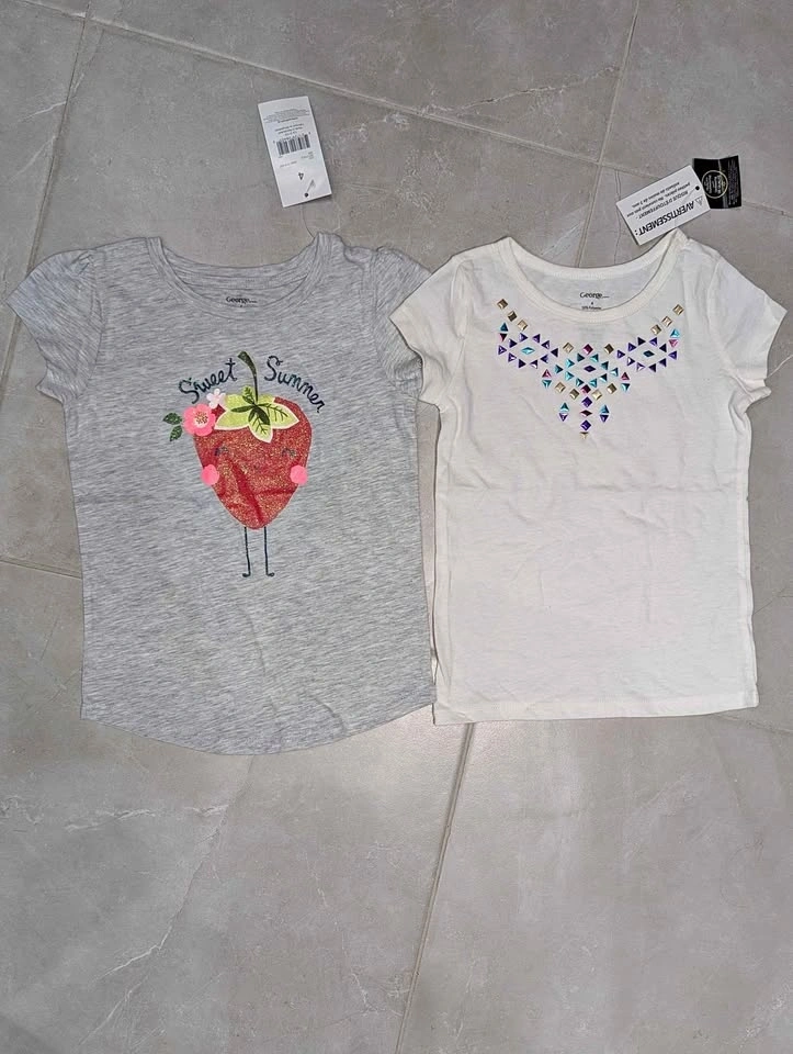 New George girls tops, size 4, 2-pack. One grey t-shirt with “Sweet Summer” strawberry graphic. One white t-shirt with studded geometric design. New with tags.