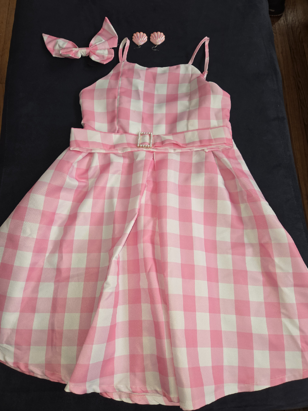 Super cute pink and white gingham dress for girls! It comes with a matching belt, hair bow, and shell earrings. Perfect for parties or playdates!