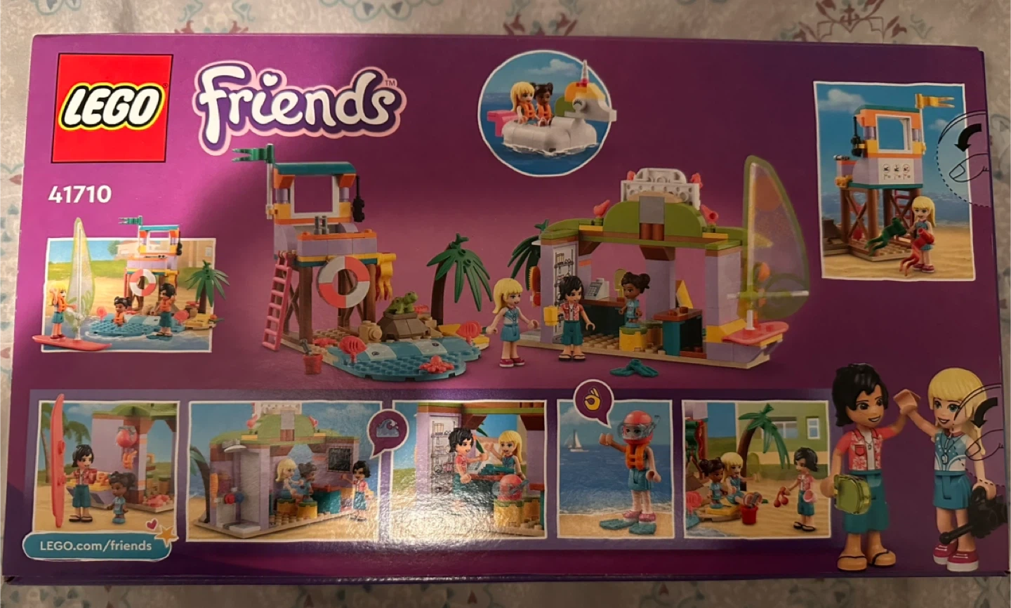 This LEGO Friends set is the Surfer Beach Fun building toy, model number 41710. It includes 288 pieces for construction. Recommended for ages 6+.