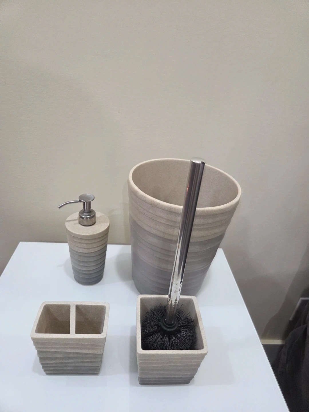 This is a four-piece bathroom accessory set. It includes a soap dispenser, a toilet brush with holder, a dual-compartment organizer, and a waste bin. The set features a layered grey and beige design.