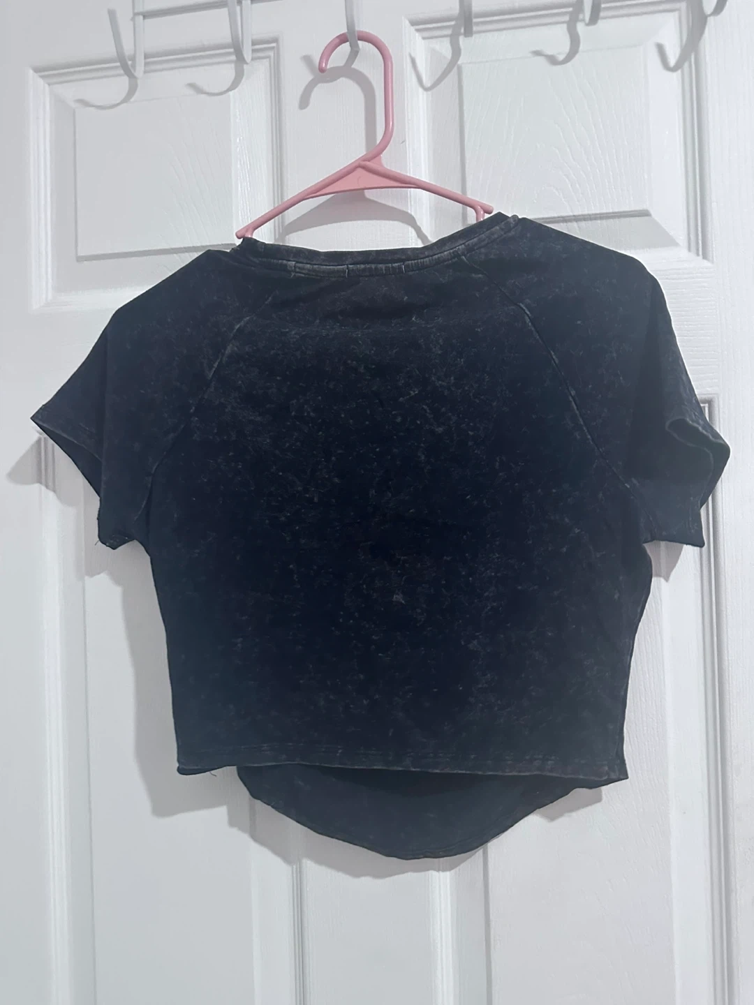 This black crop top features a 'New York 8 South of Houston St.' graphic. It's a size medium with a mineral wash finish. This top is made from a soft fabric blend.