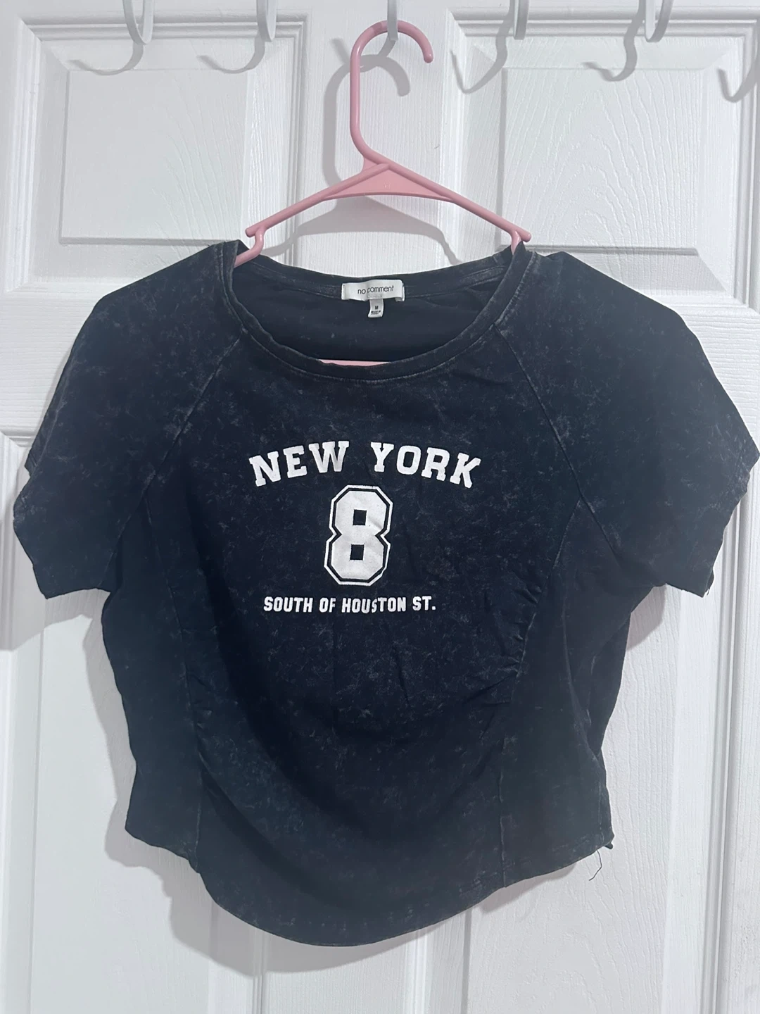 This black crop top features a 'New York 8 South of Houston St.' graphic. It's a size medium with a mineral wash finish. This top is made from a soft fabric blend.