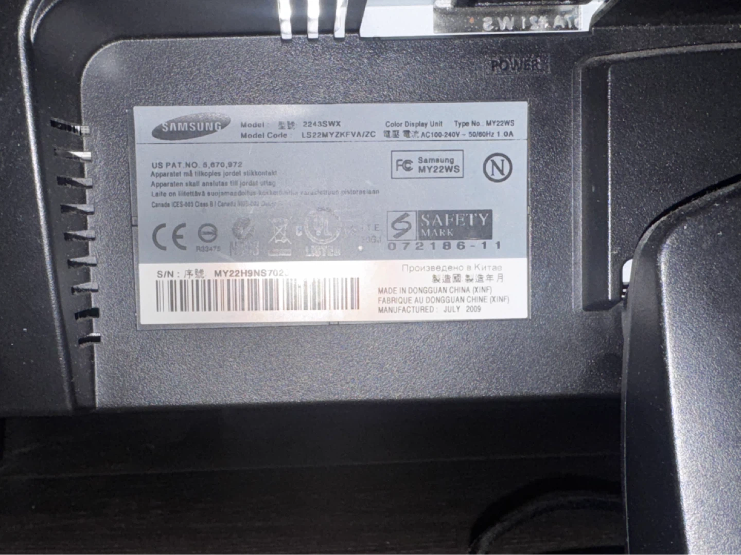 Samsung 22" widescreen monitor, model LS22MYFXFVA/ZC. Manufactured in July 2009. A good monitor for general computer use. Old but still works. No hdmi cable with it.