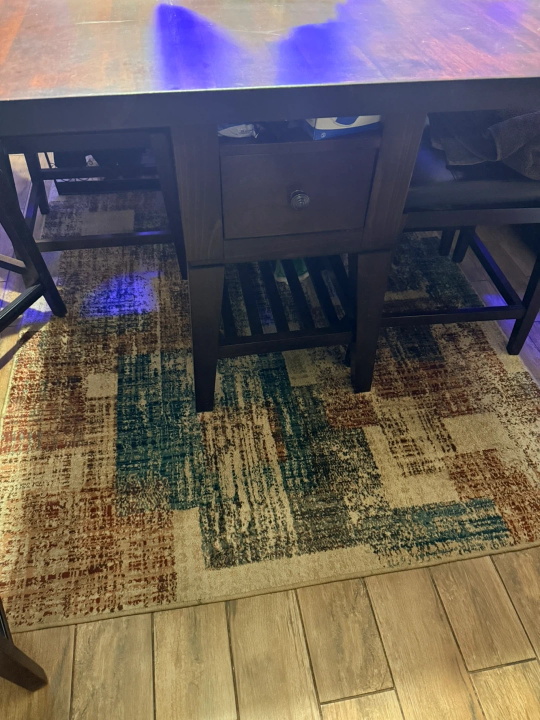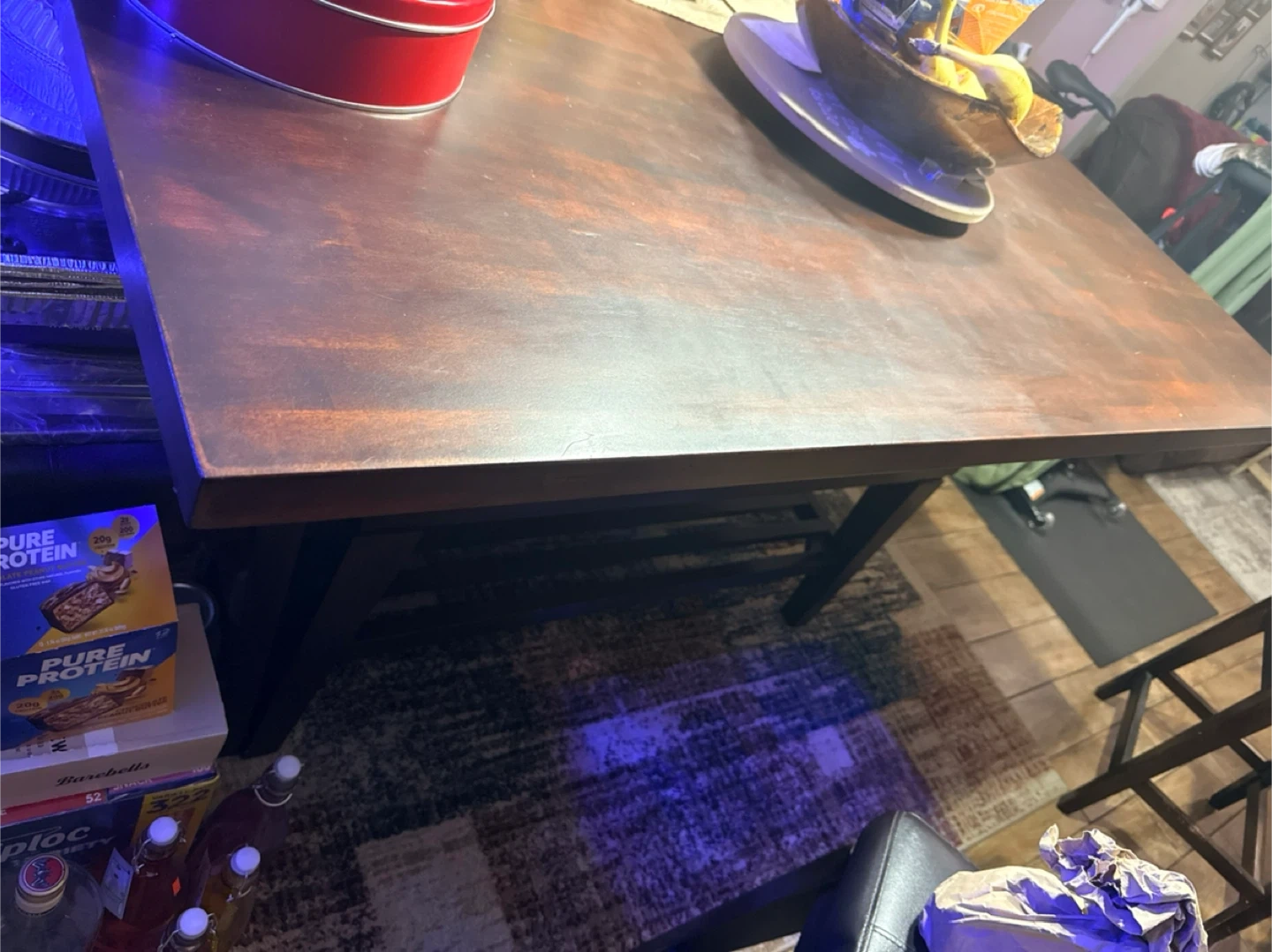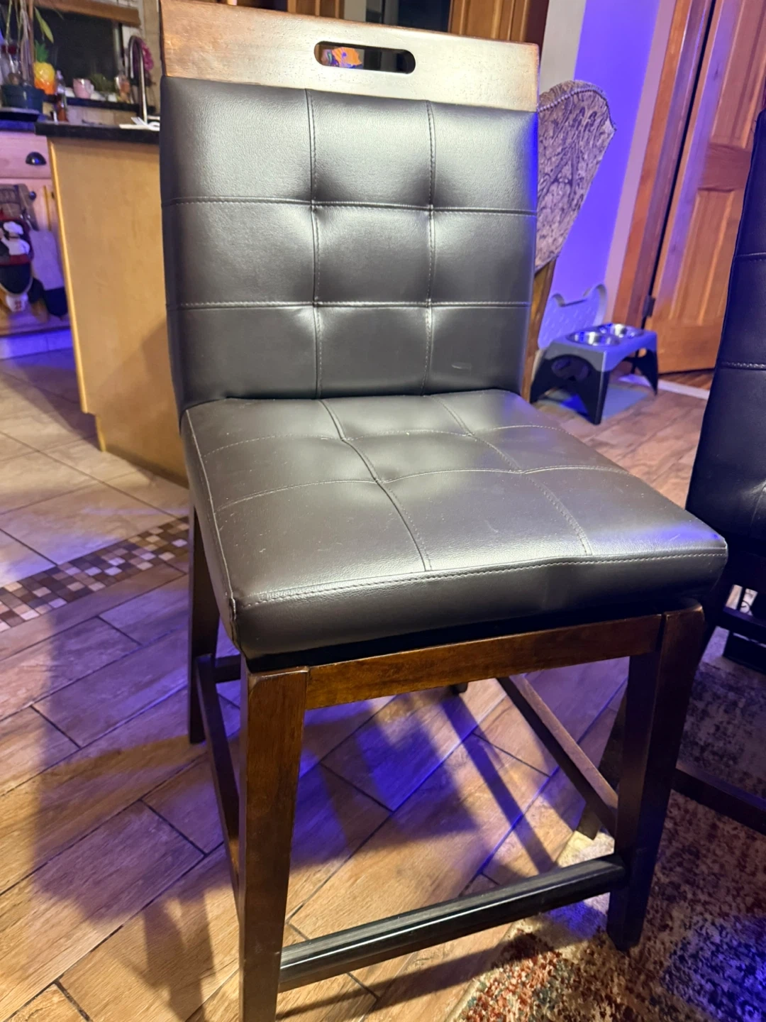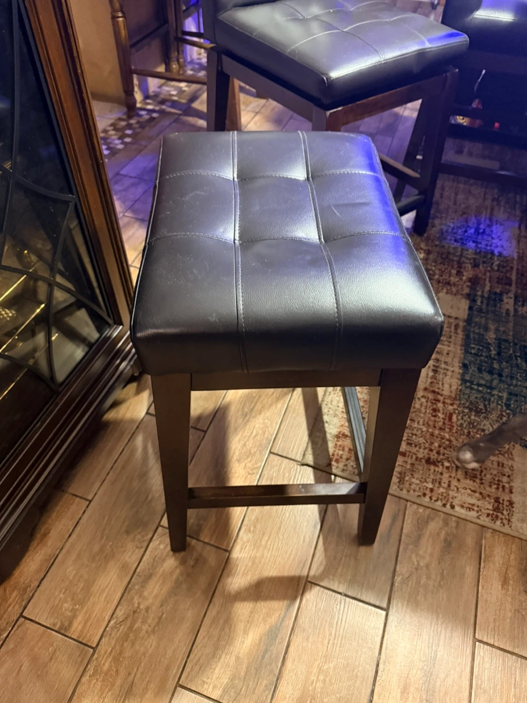 I'm selling a dining table with 2 side backless bar stools and 4 bar stools, The table has a dark brown finish and includes a built-in wine rack. The bar stools are upholstered with a dark brown leather-like material. It's a great set for a kitchen or dining area!