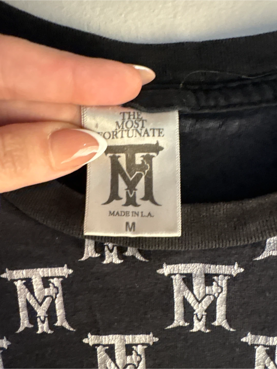 This is a black t-shirt with an all-over white "TM" monogram print. It's made in L.A. and features a crew neck and short sleeves. The material is soft cotton.