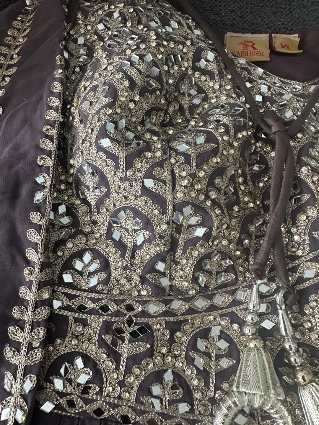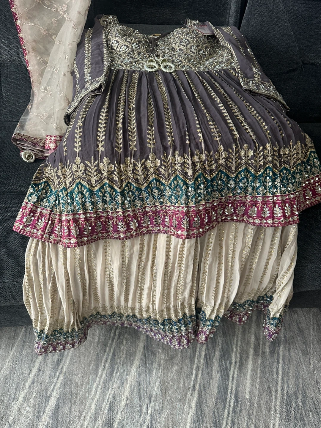 Brand new suit. This is a VIVAAH branded 3 piece suit It features intricate embroidery with bead and mirror shisha work and shags work. All over work on the dress front and back and work all over plazo pants and dupatta. Heavy suit and extremely beautiful will be a show stopper who ever wears it. It’s large to Xl just in time for Eid