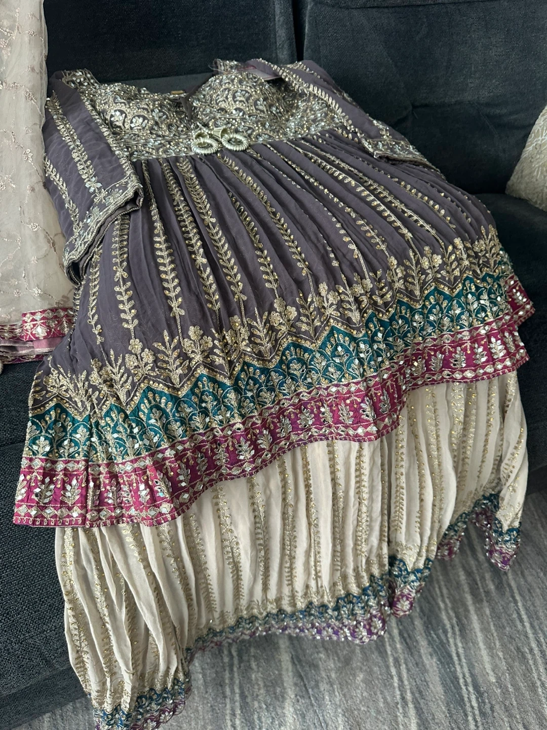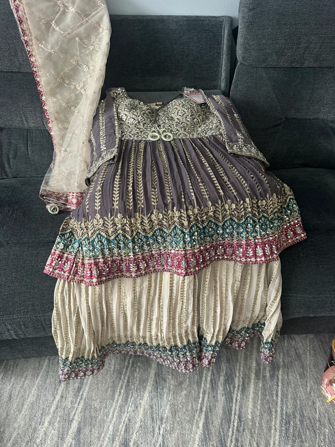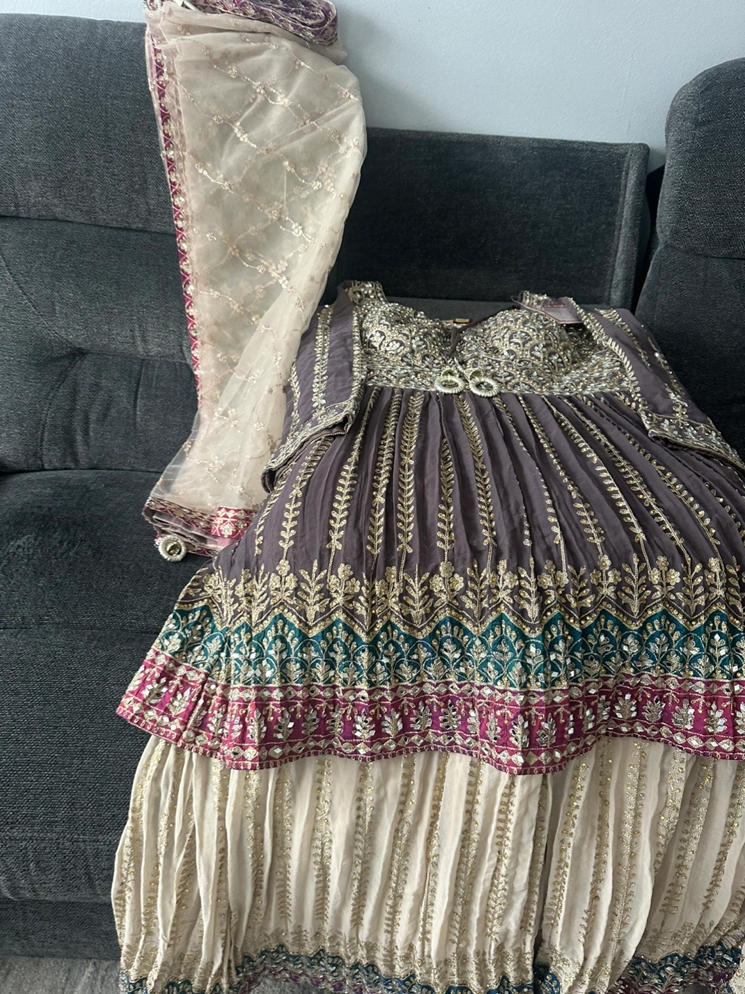 Brand new suit. This is a VIVAAH branded 3 piece suit It features intricate embroidery with bead and mirror shisha work and shags work. All over work on the dress front and back and work all over plazo pants and dupatta. Heavy suit and extremely beautiful will be a show stopper who ever wears it. It’s large to Xl just in time for Eid