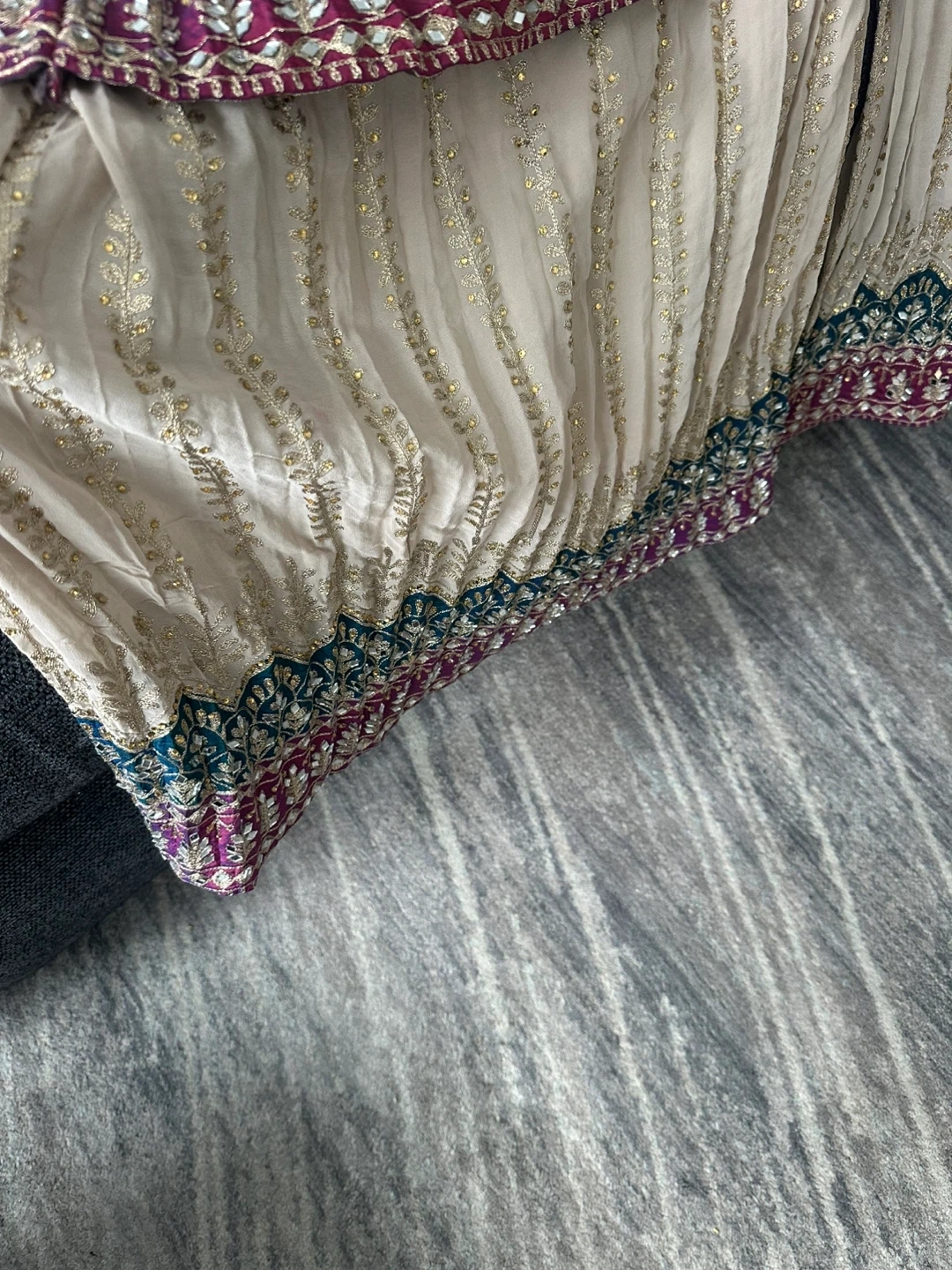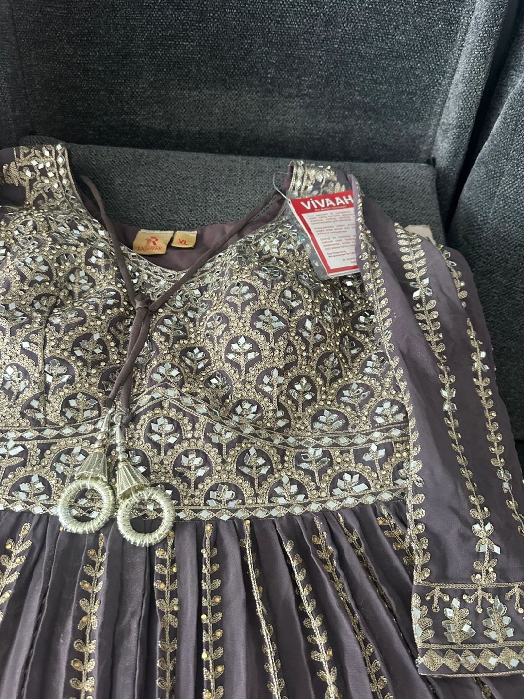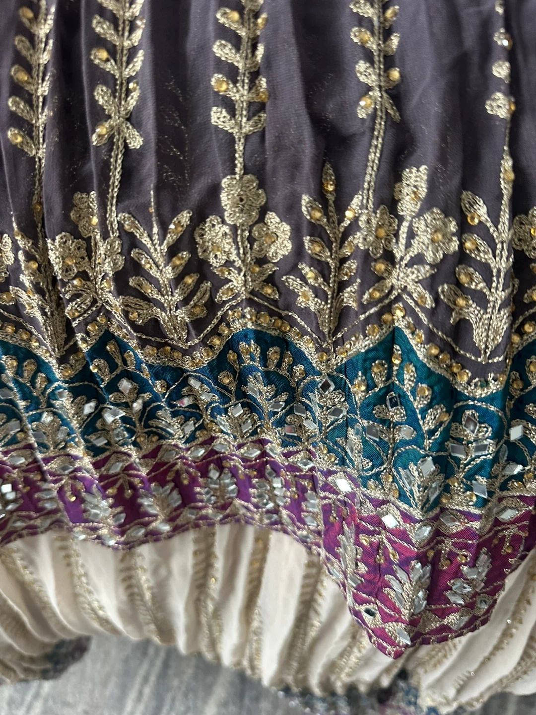 Brand new suit. This is a VIVAAH branded 3 piece suit It features intricate embroidery with bead and mirror shisha work and shags work. All over work on the dress front and back and work all over plazo pants and dupatta. Heavy suit and extremely beautiful will be a show stopper who ever wears it. It’s large to Xl just in time for Eid
