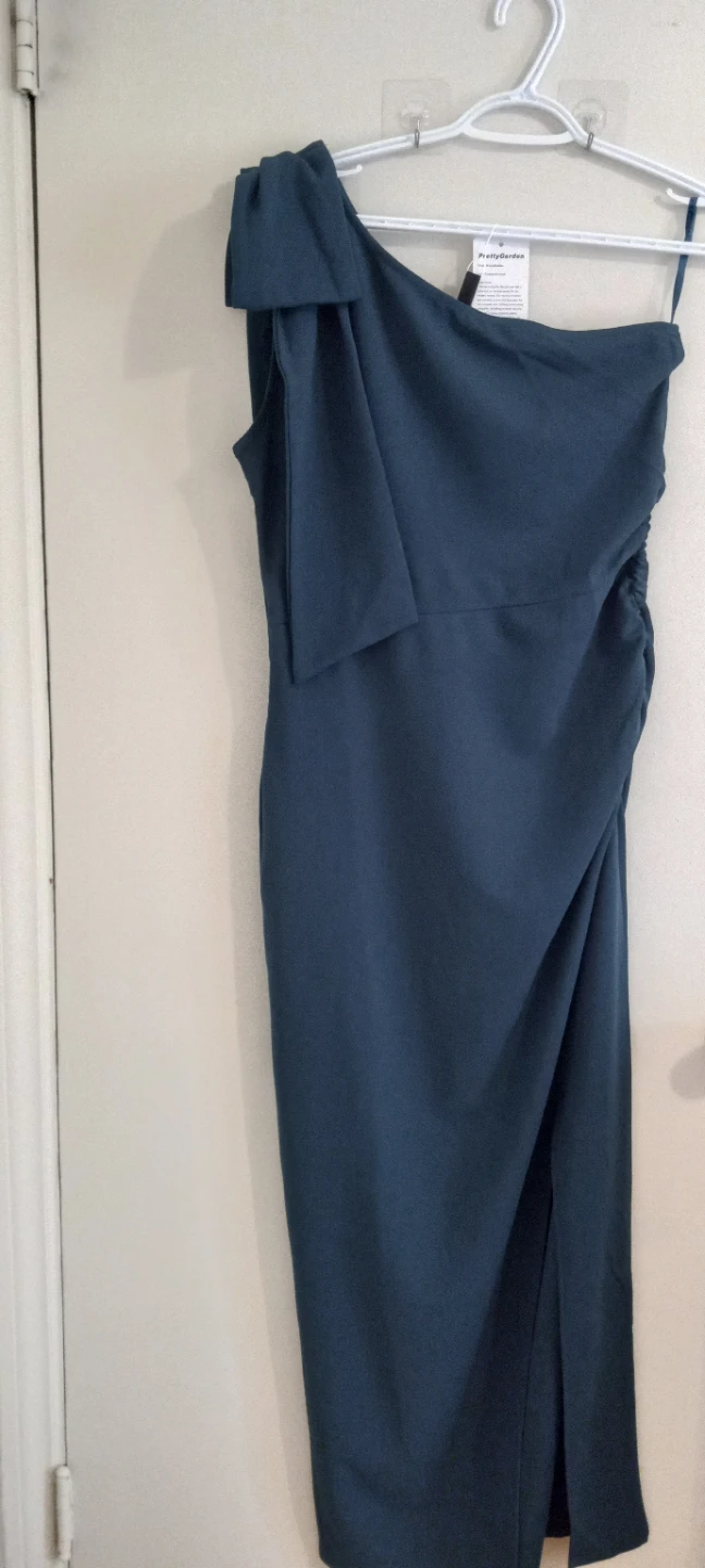 This PrettyGarden dress features a stylish one-shoulder design with elegant ruching on the side. It has a chic bow detail on the shoulder and a tasteful thigh-high slit. Perfect for evening events or a formal gathering!
