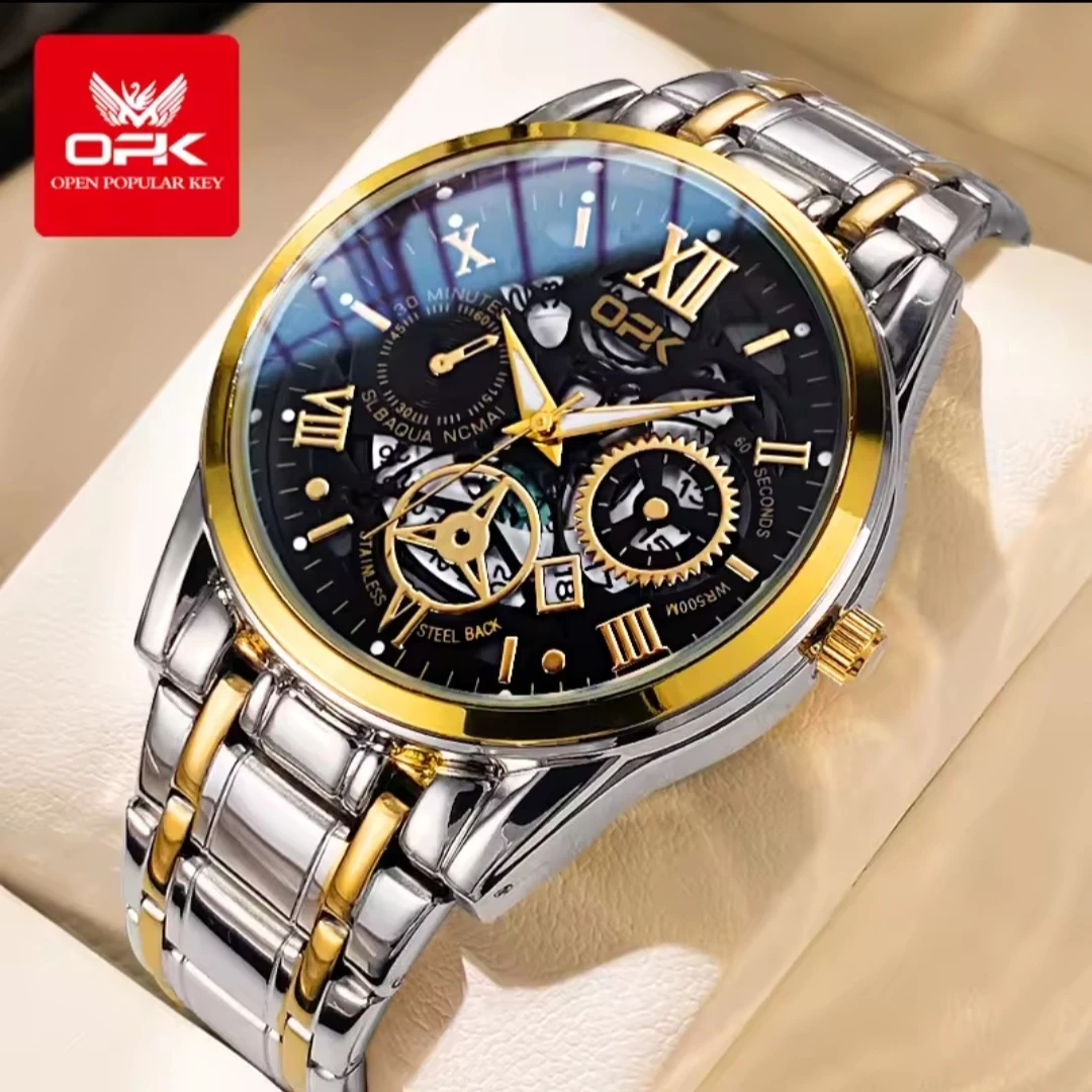 Selling a stylish OPK men's watch! It features a stainless steel band with gold accents and a unique skeleton dial. A great addition to any outfit!