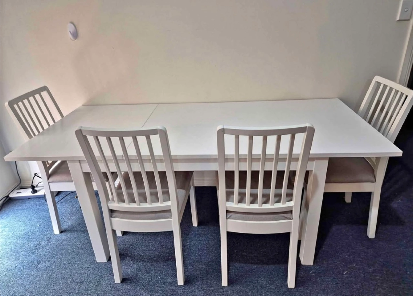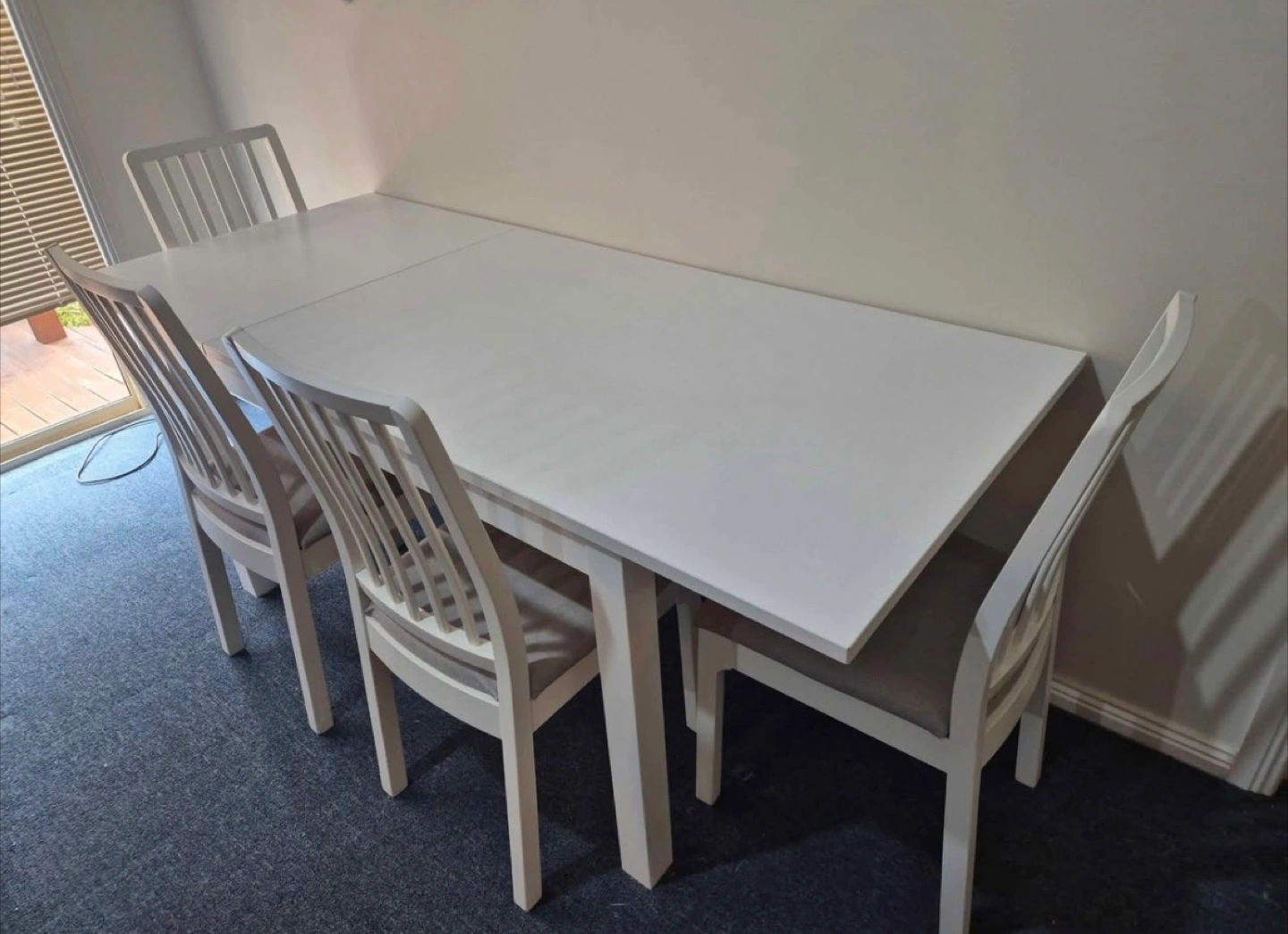 Ikea dining set with a Laneberg white extendable solid wood table and 4 Ekedalen white chairs (with light grey covers) —all in good condition.