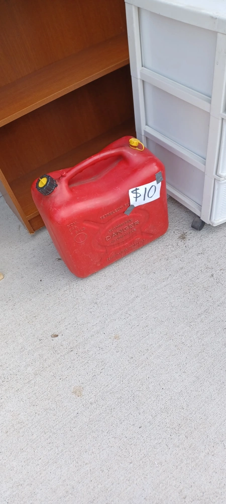 Selling a red gas can, marked at $10. It's in used condition, perfect for storing fuel for your lawnmower or other equipment