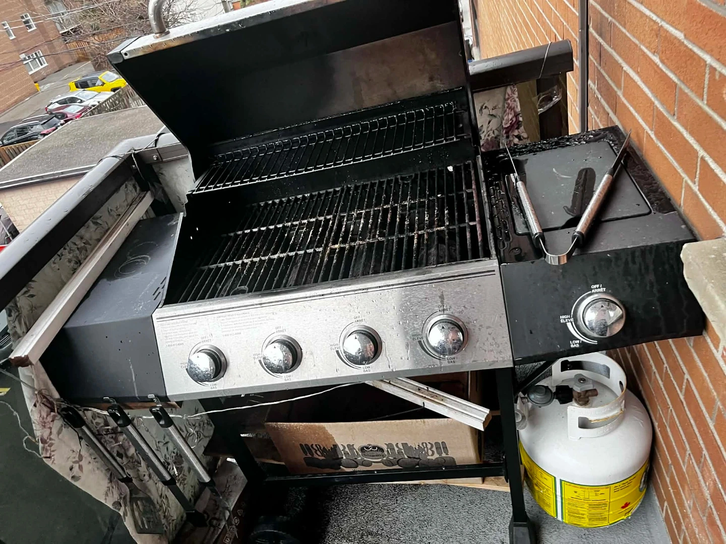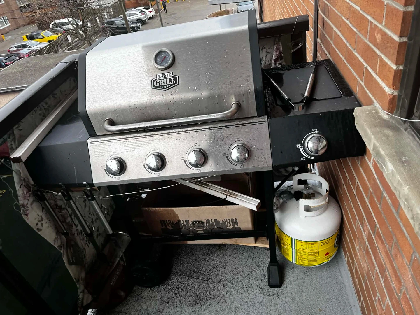 This Master Grill propane barbecue comes with four main burners and a convenient side burner. It features a built-in thermometer on the lid for temperature monitoring. Propane tank is included and attached. It's ready for your next backyard cookout!