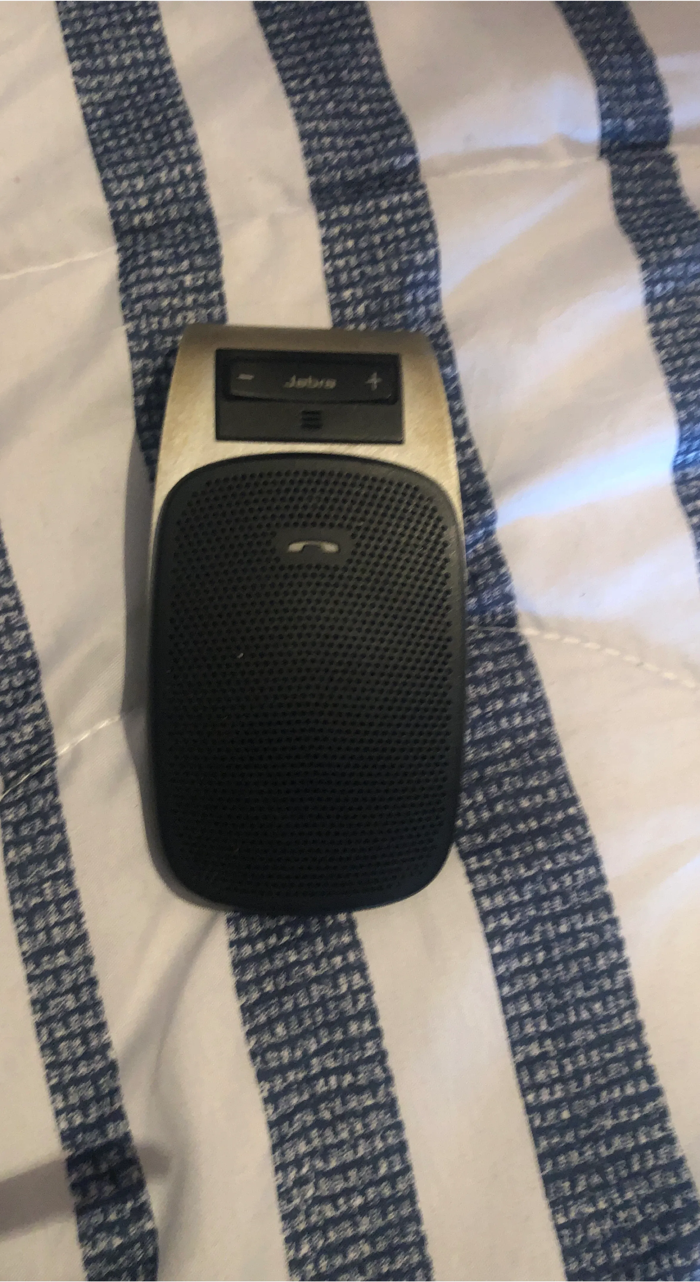 This is a Jabra Bluetooth speakerphone. It's black and has a metallic top. It includes volume controls and a call button.