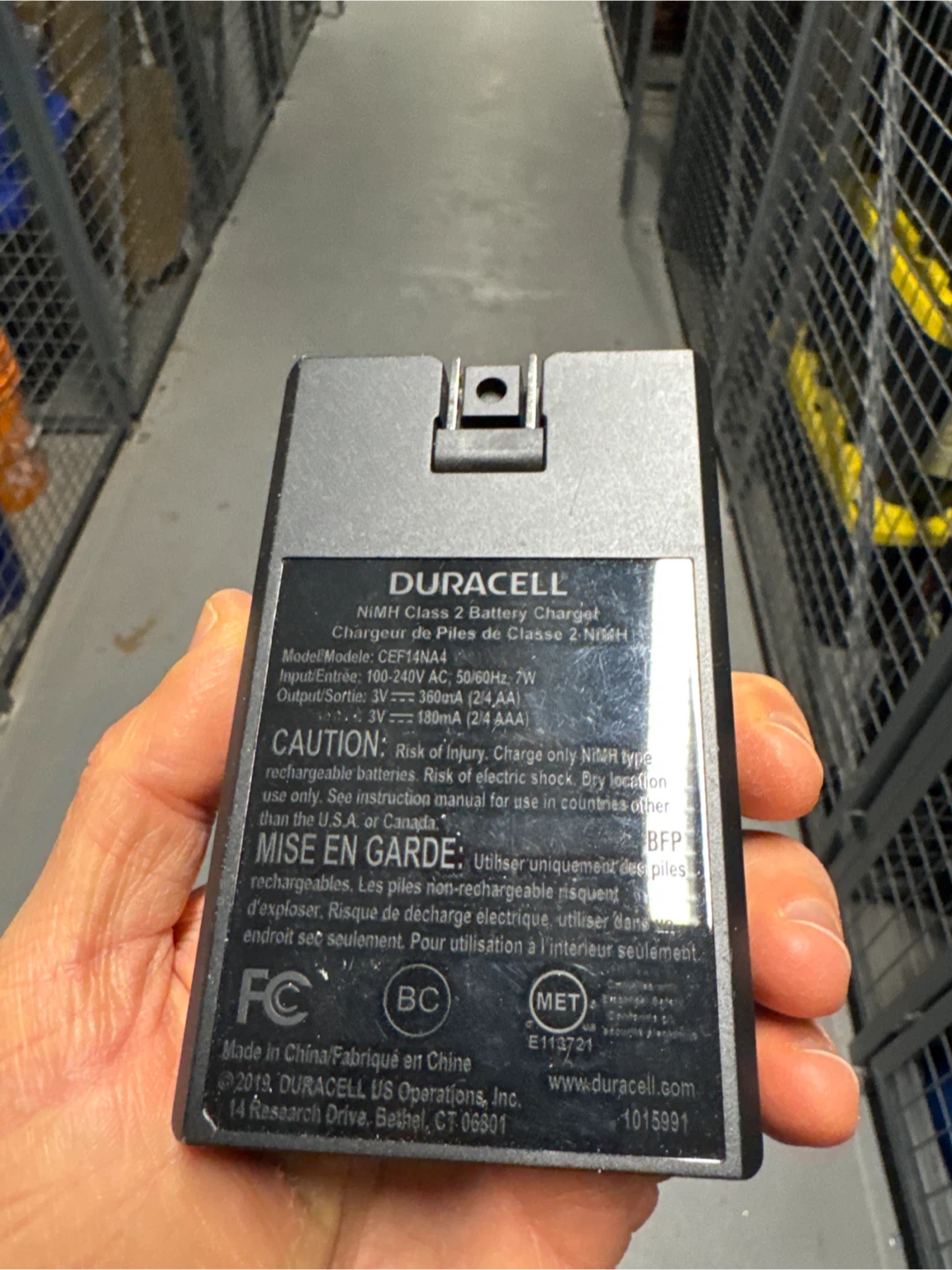 Selling a Duracell CEF14NA4 NiMH Class 2 Battery Charger. It supports an input of 100-240V AC, 50/60Hz, 7W, and an output of 3V - 380mA (2/4 AA).