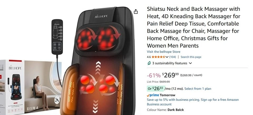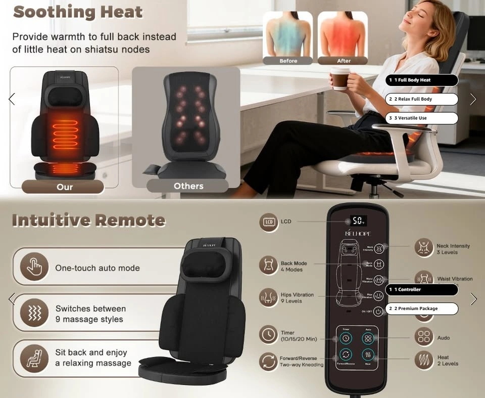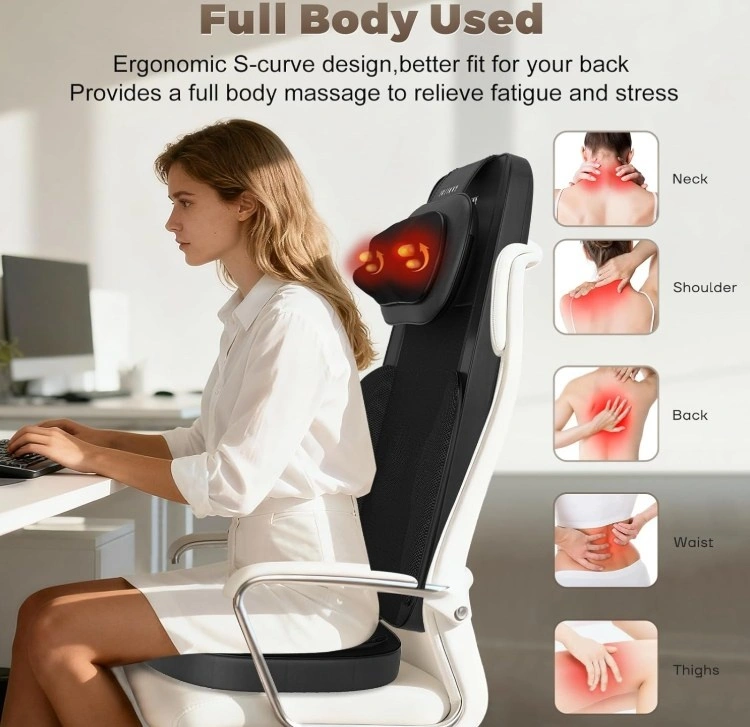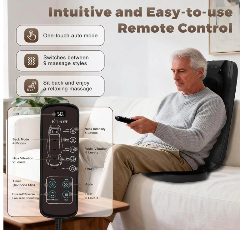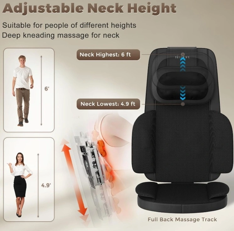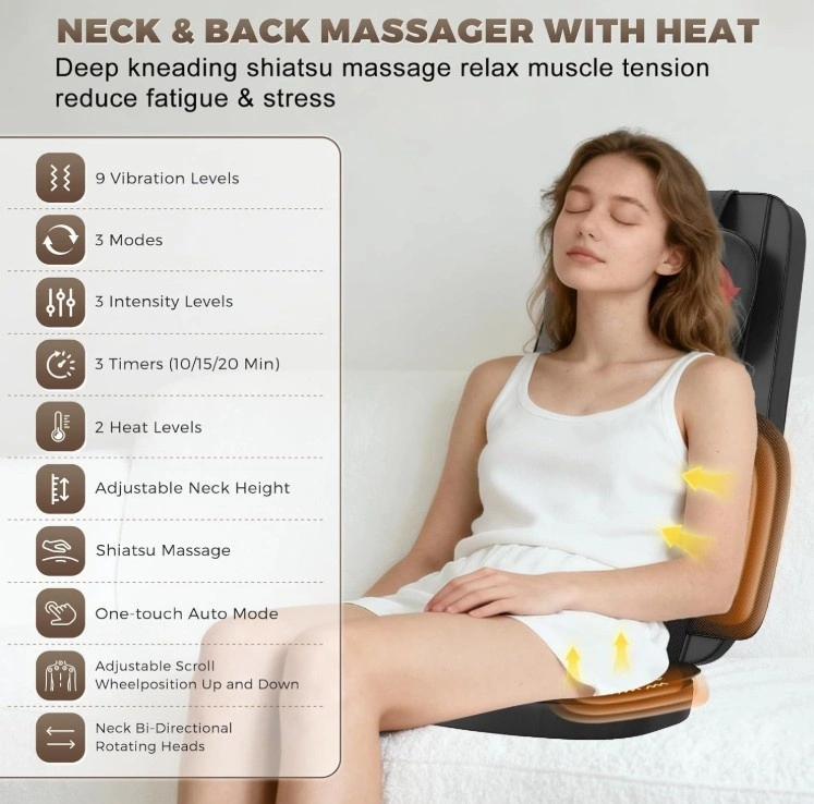 This back massager features 4D Shiatsu kneading, rolling, vibration, and soothing heat functions, targeting your neck, back, hips, and legs to ease muscle aches and fatigue. Activate Auto Mode for an automatic cycle of 9 professional massage techniques. The head massager height is adjustable and can be disassembled separately.