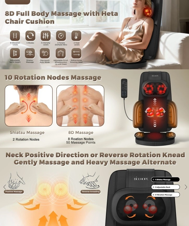 This back massager features 4D Shiatsu kneading, rolling, vibration, and soothing heat functions, targeting your neck, back, hips, and legs to ease muscle aches and fatigue. Activate Auto Mode for an automatic cycle of 9 professional massage techniques. The head massager height is adjustable and can be disassembled separately.