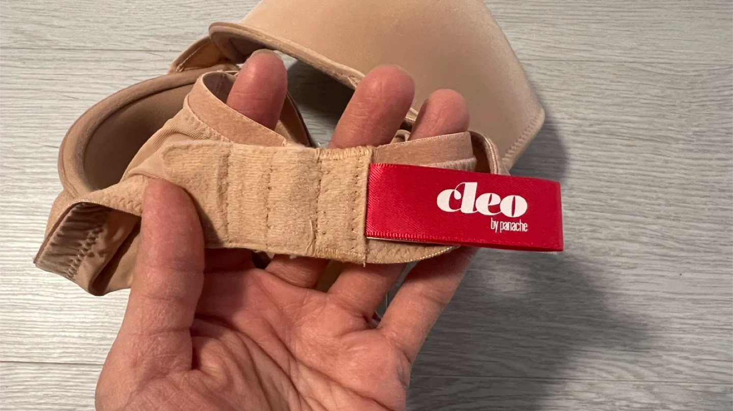 This is a beige balconette bra by Cleo by Panache. It's a size 30FF in UK sizing. Hand wash only, do not tumble dry, bleach, or dry clean.