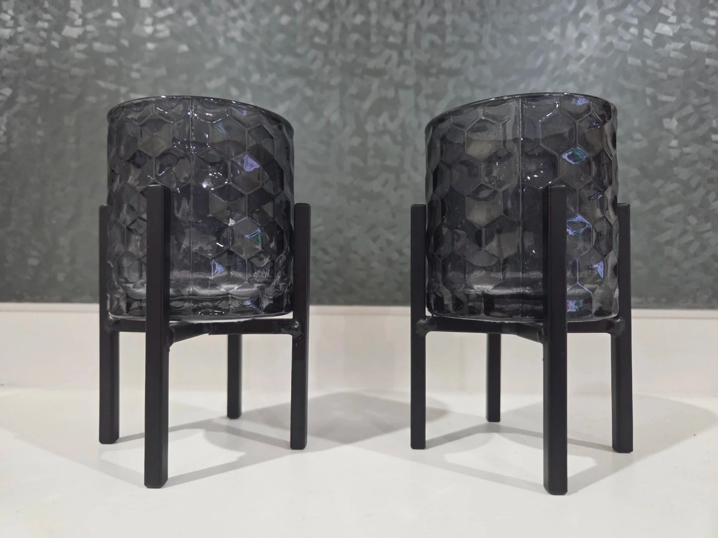 This set includes two grey glass candle holders with a geometric pattern. They stand on black metal bases. Perfect for adding a stylish touch to any room!
