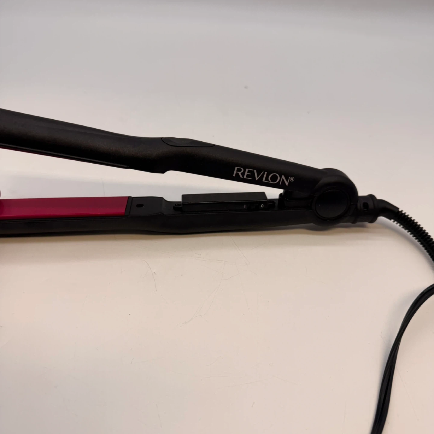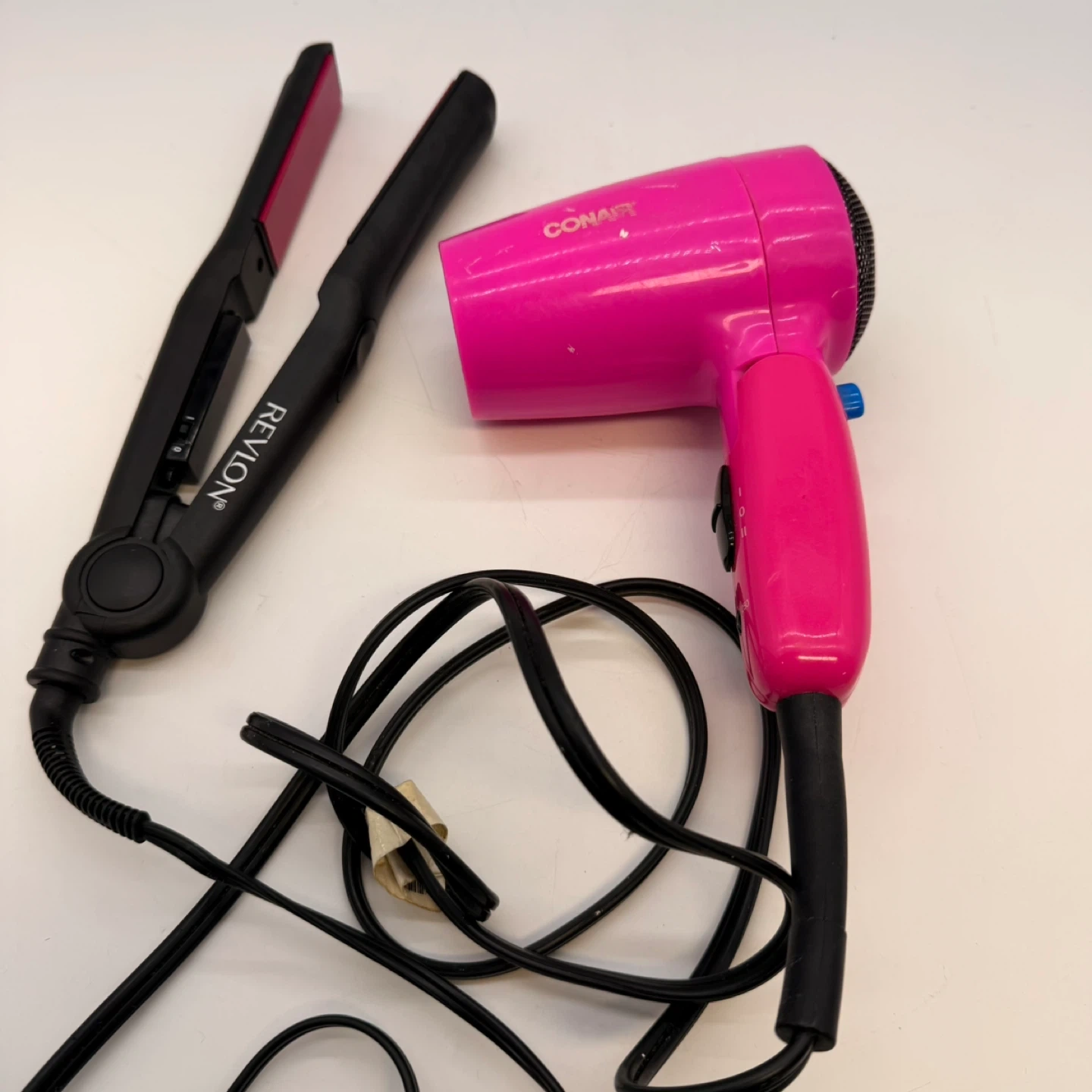 This listing includes a black Revlon flat iron with pink plates and a bright pink Conair mini hair dryer. Both items are in good condition and ready for use.
